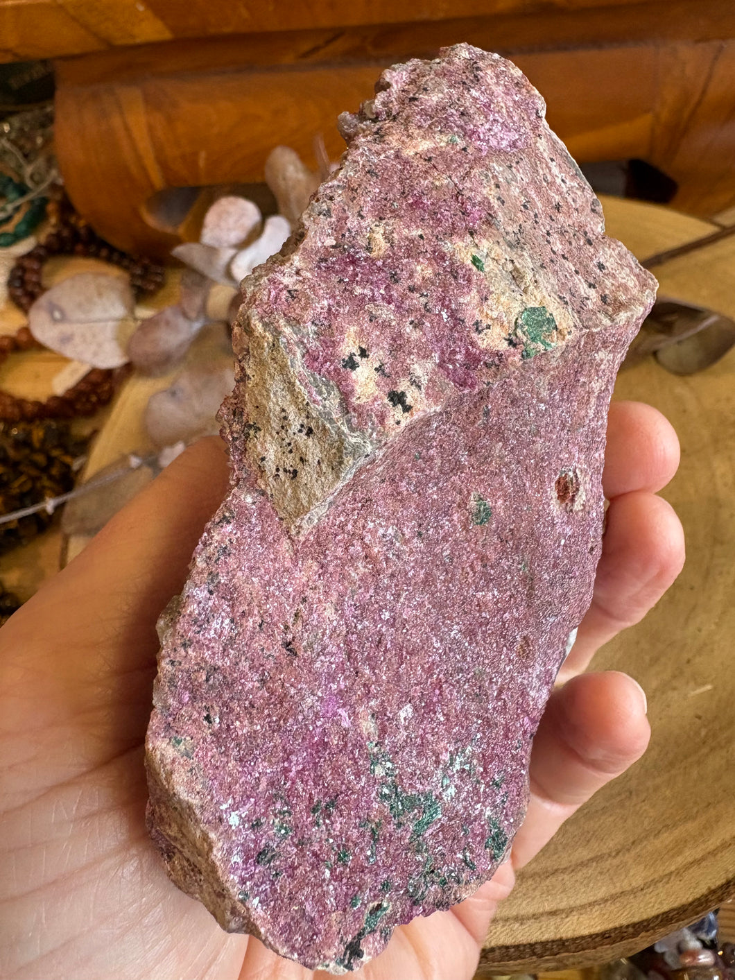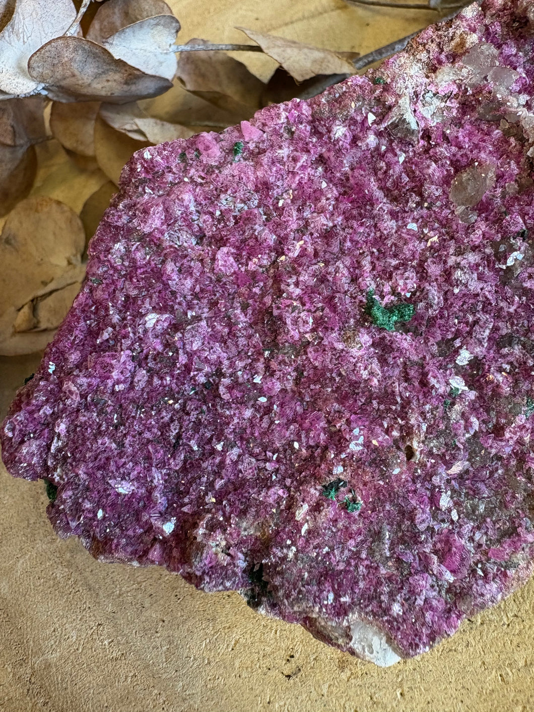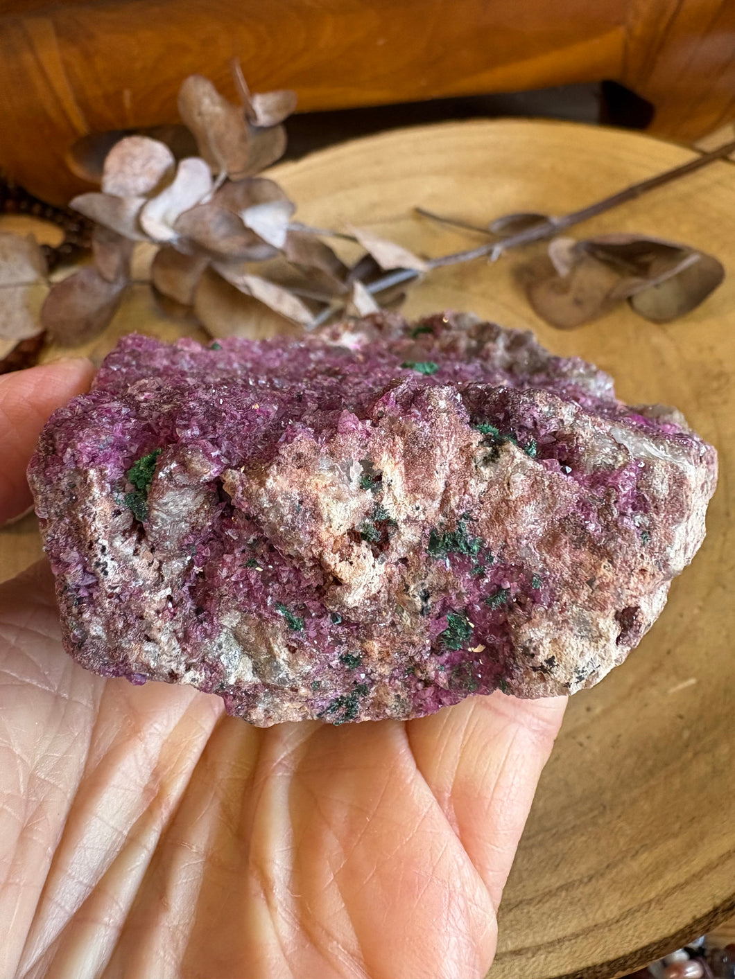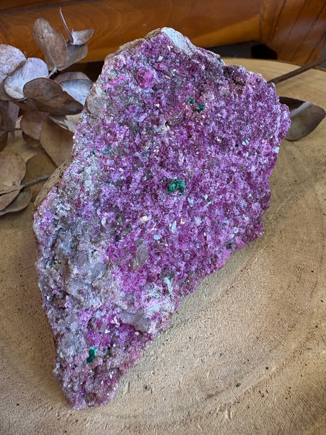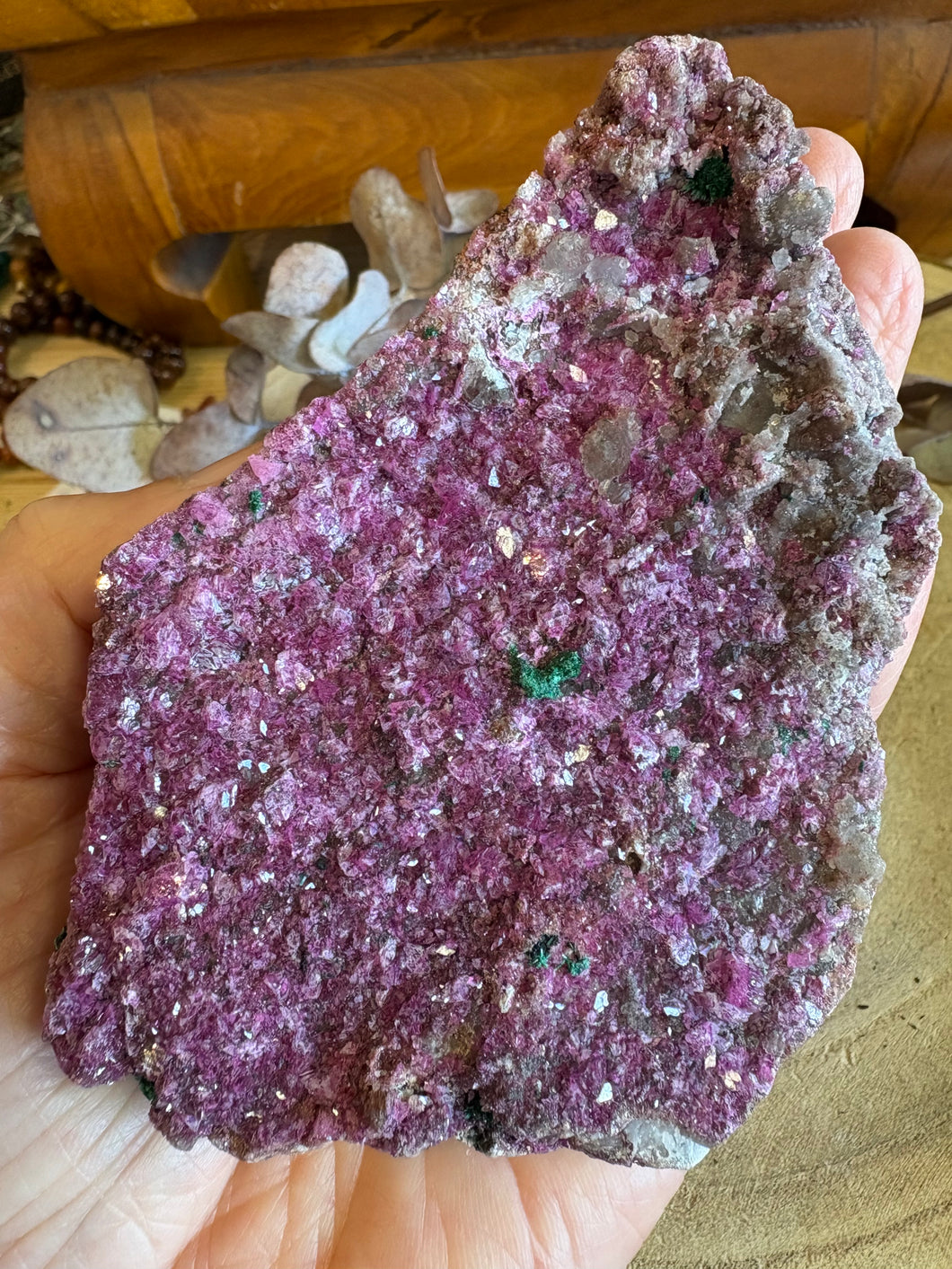 A larger sized cluster of colourful Cobalto Calcite with a smattering of Malachite dotted through.