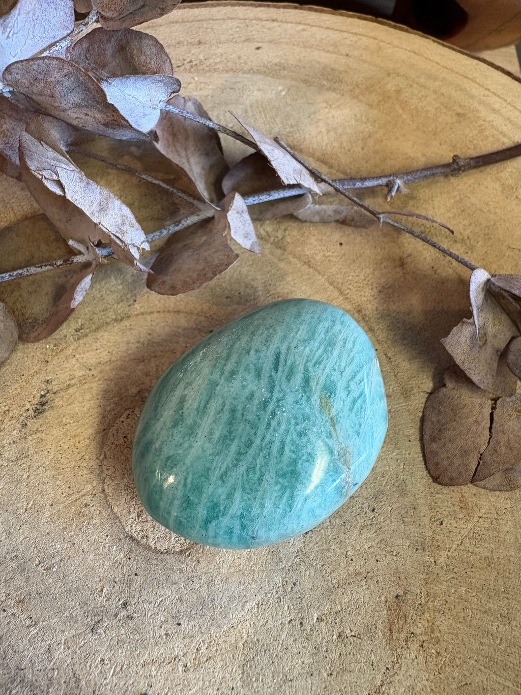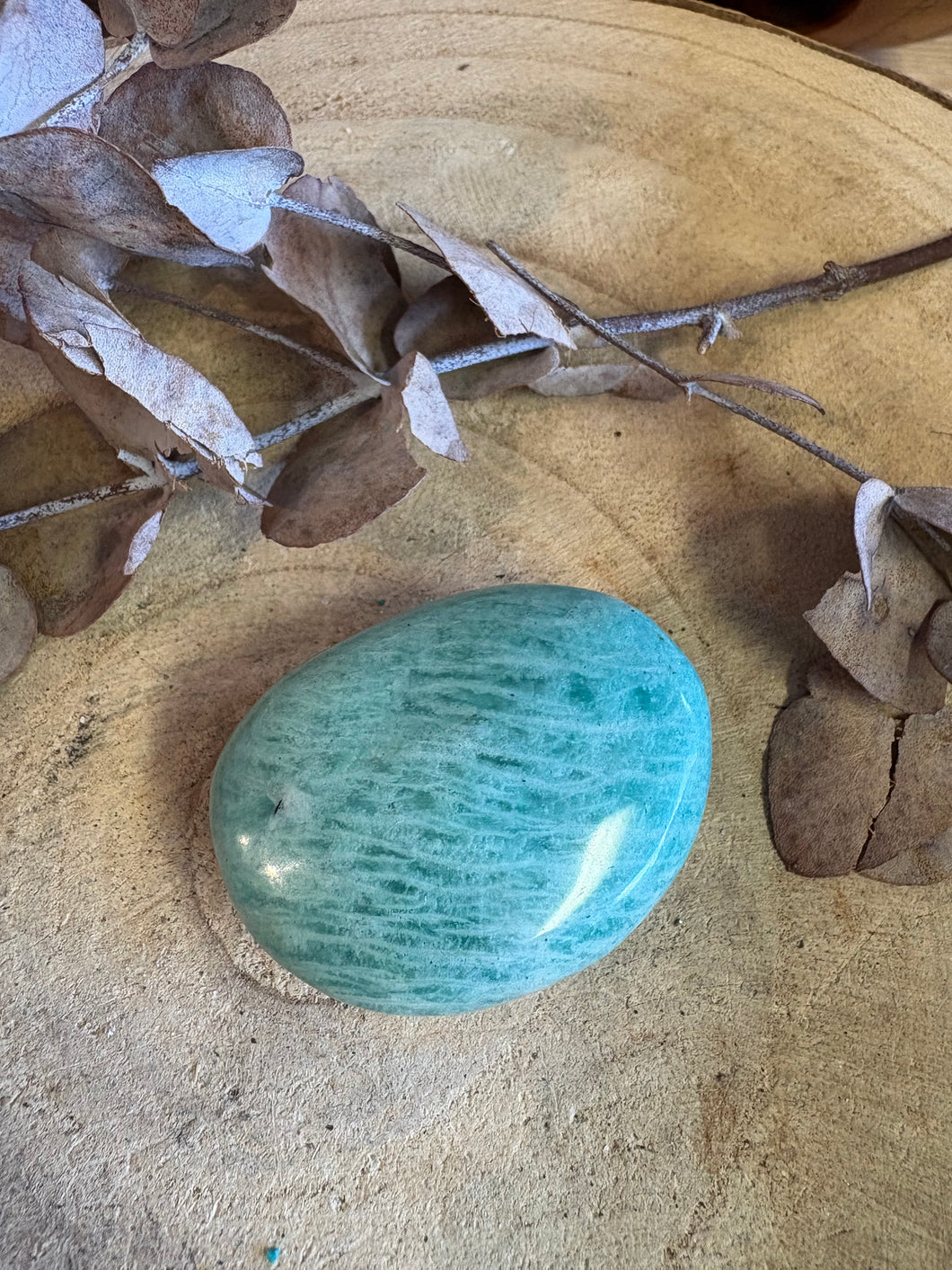 A shimmering palm stone or soothing and hopeful Amazonite.