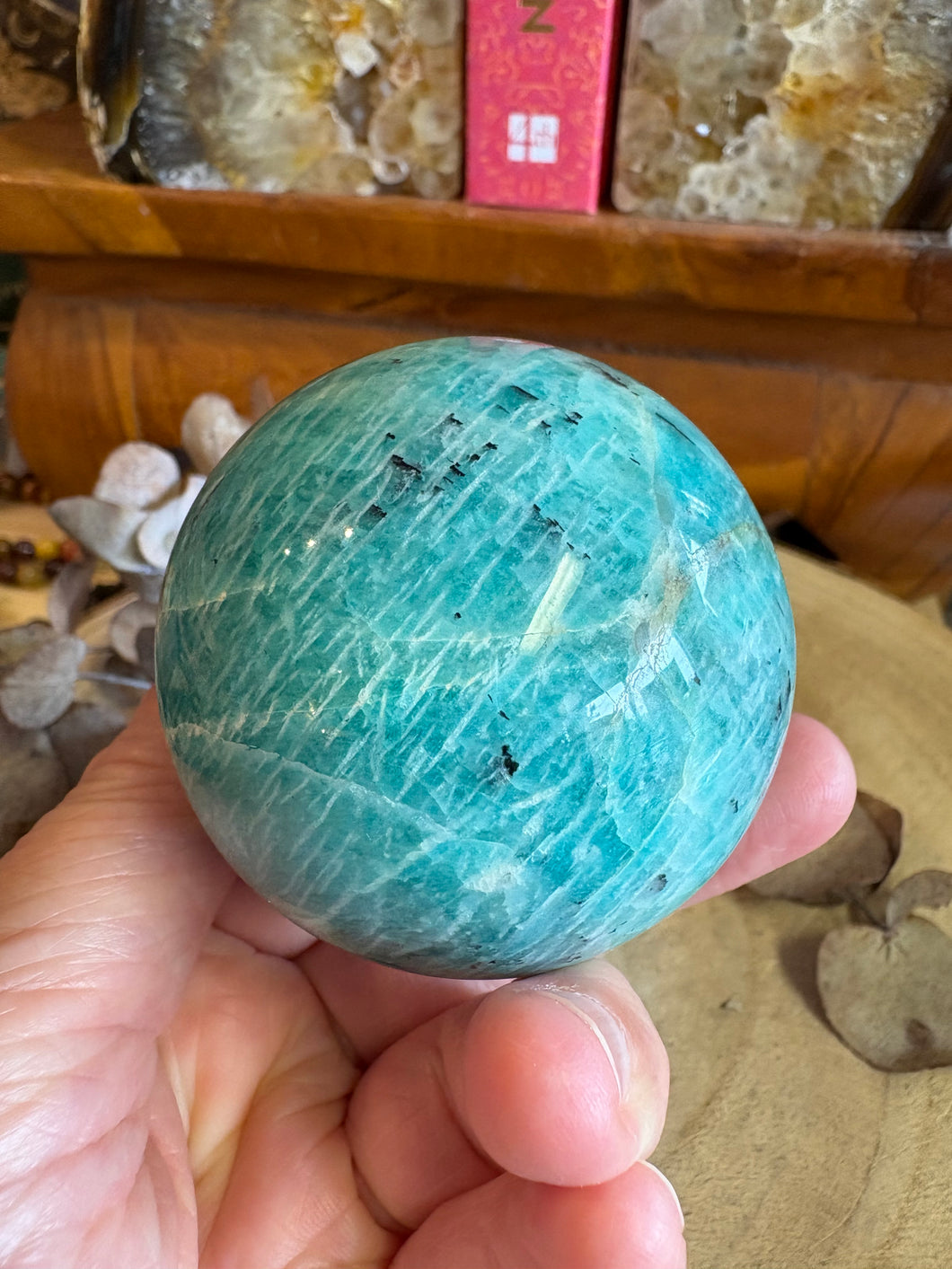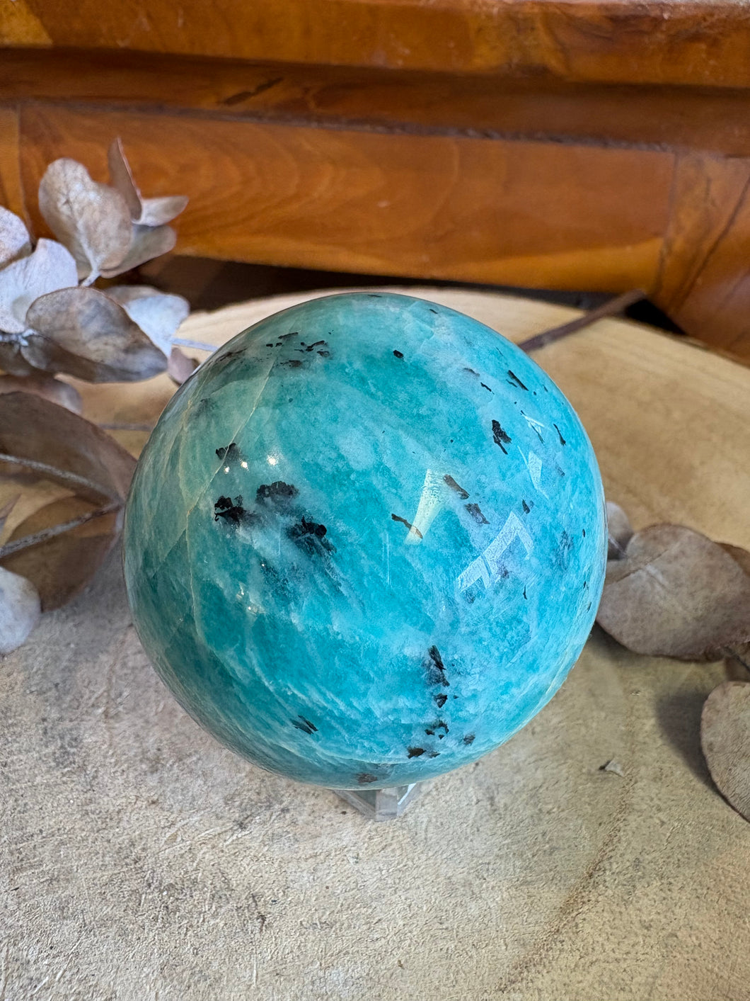 This sphere has a beautiful colour, and lots of Black Tourmaline speckling across its surface, giving it an extra visual and energetic punch.