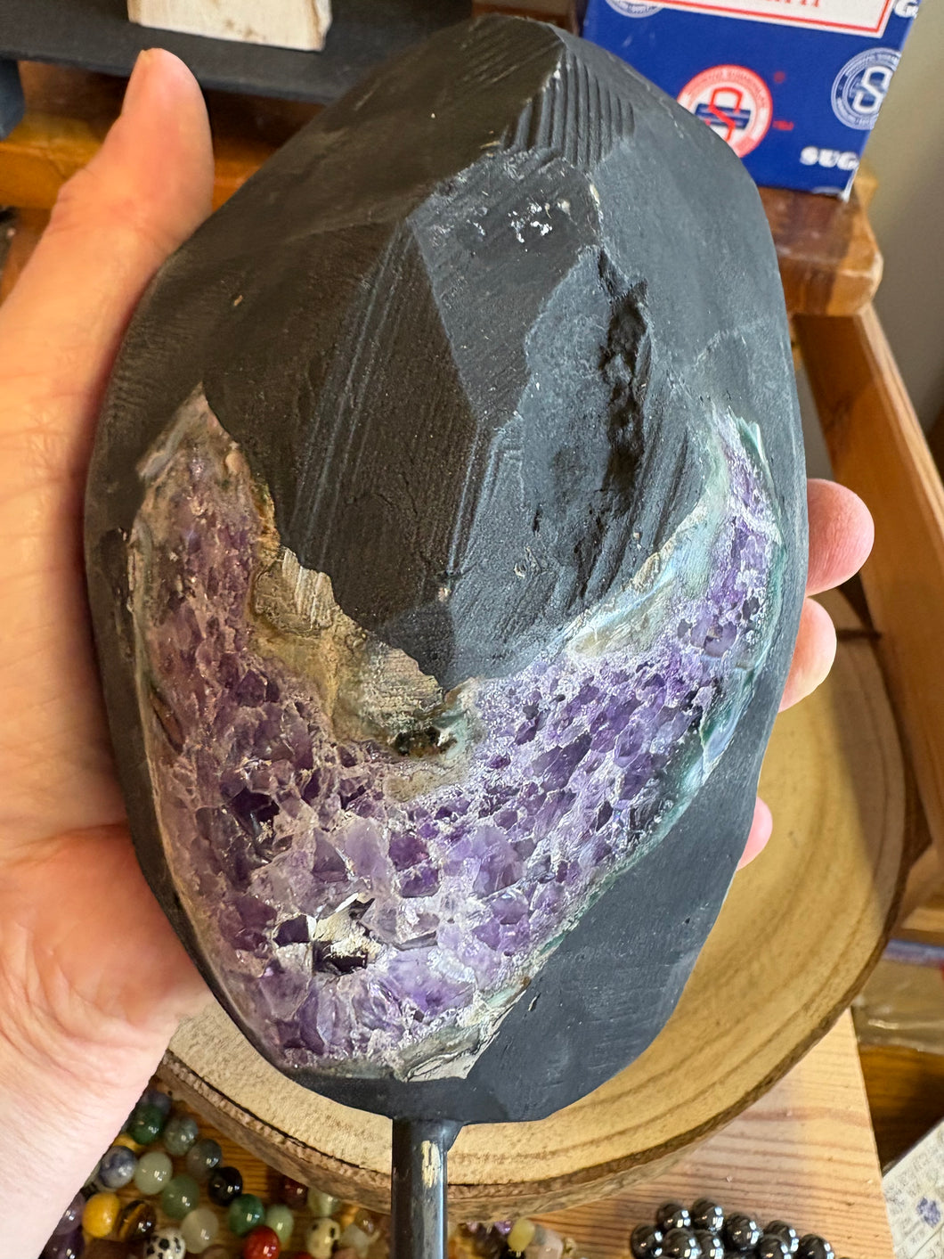 The stand is perfect to lend height to this beauty, and on its back, there is an Amethyst window in the shape of a smile.