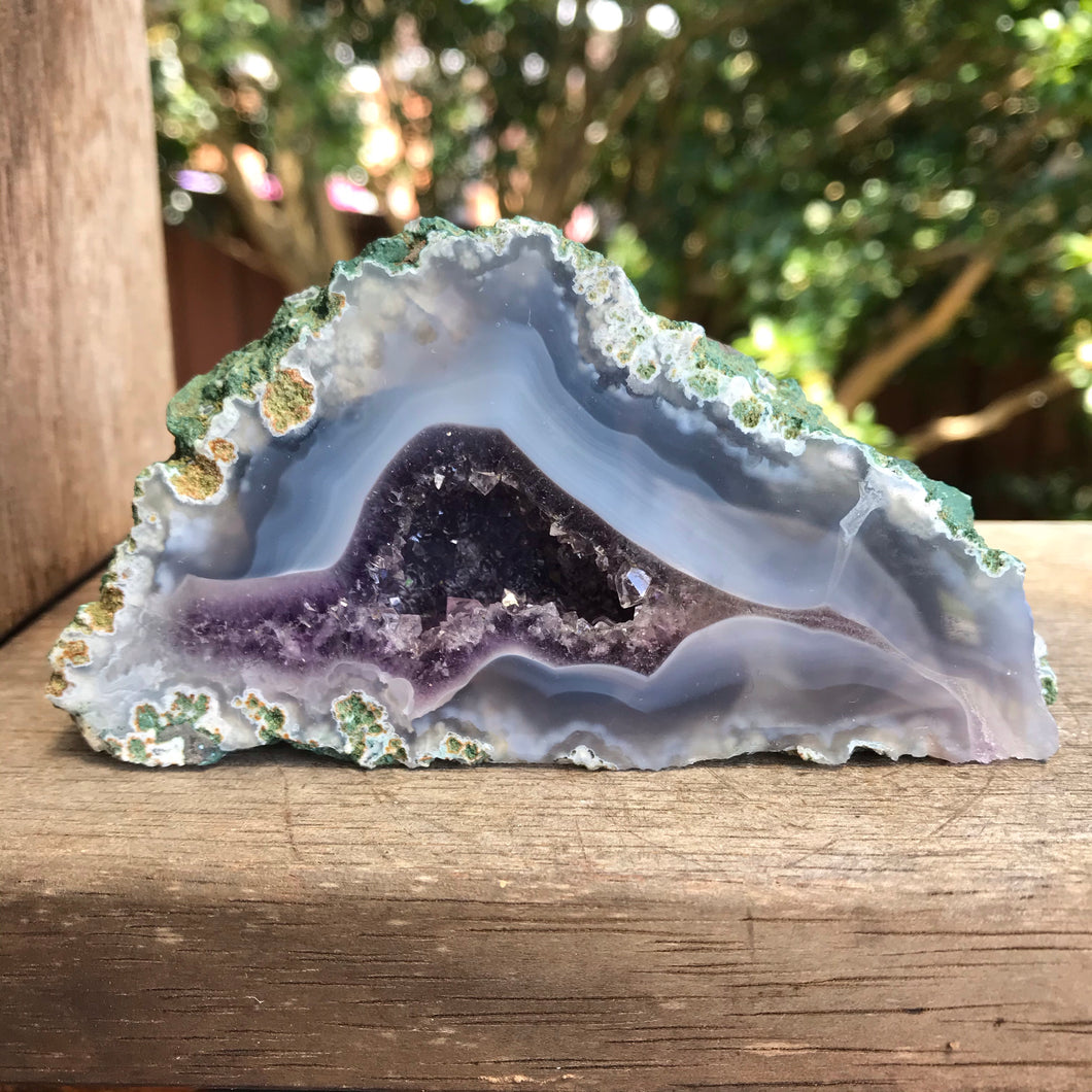 This darling little piece has the most exquisite agate banding and sparkly amethyst centre.