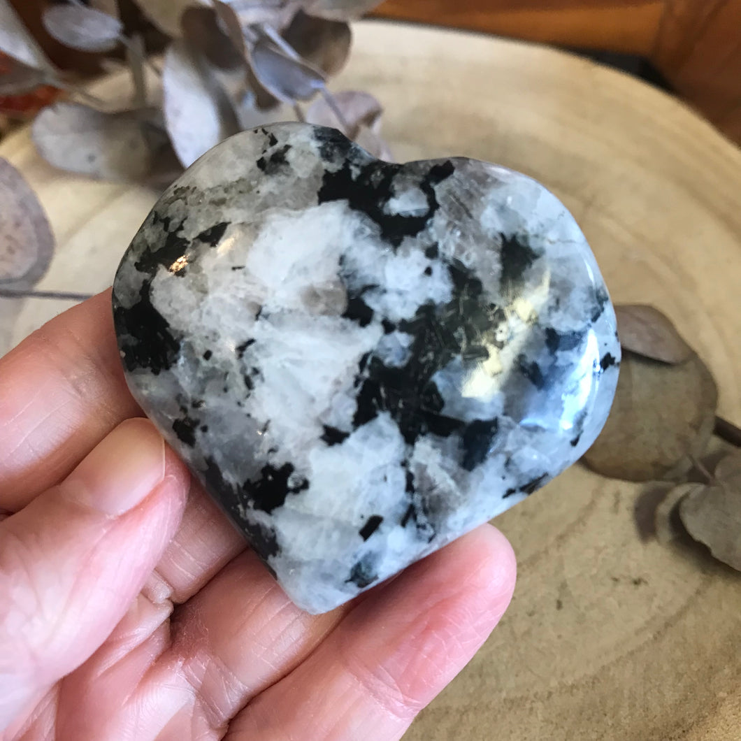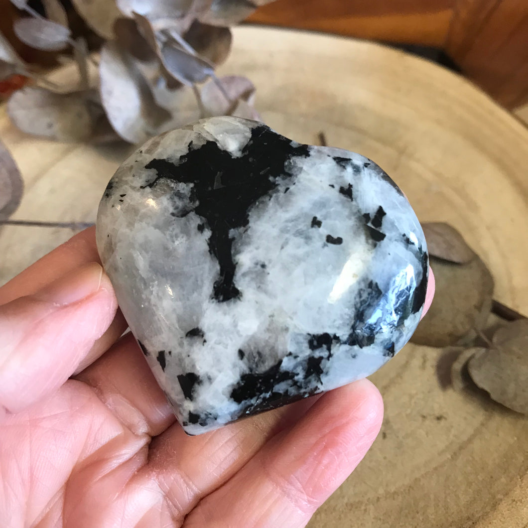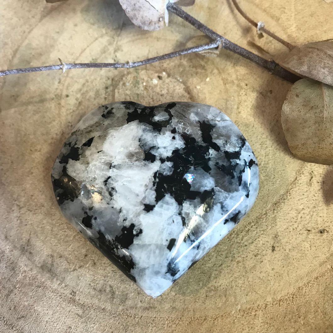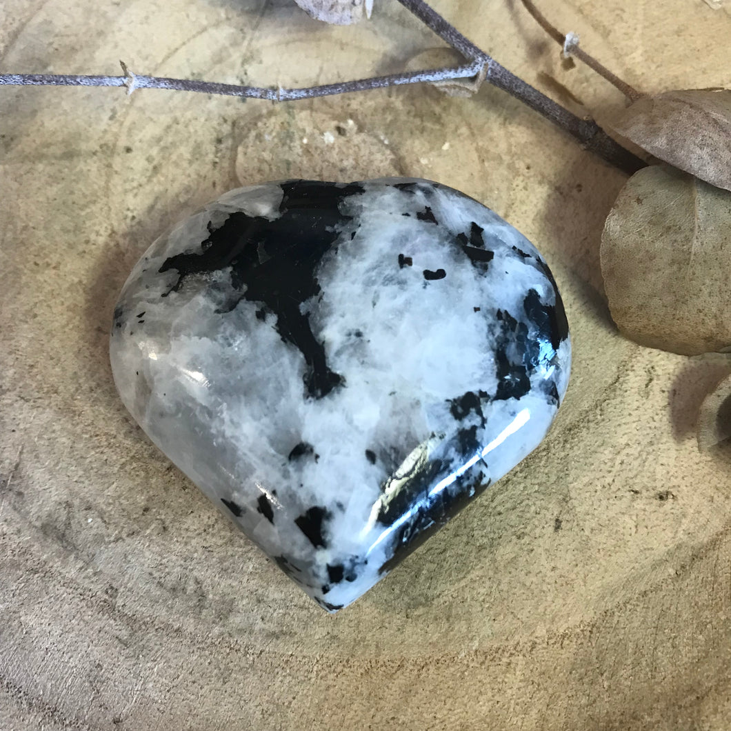 A lovely heart of Rainbow Moonstone with a high saturation of Black Tourmaline.