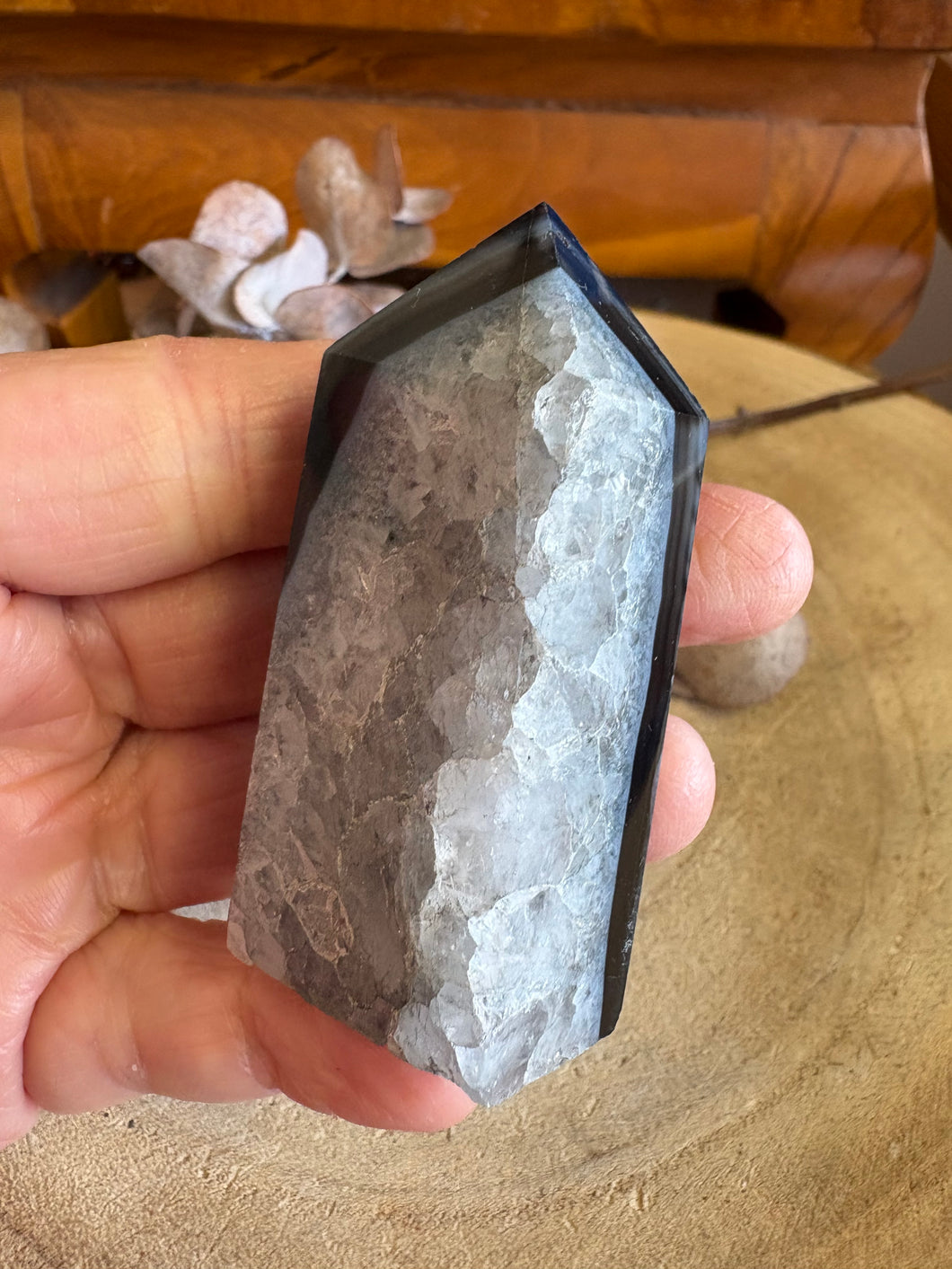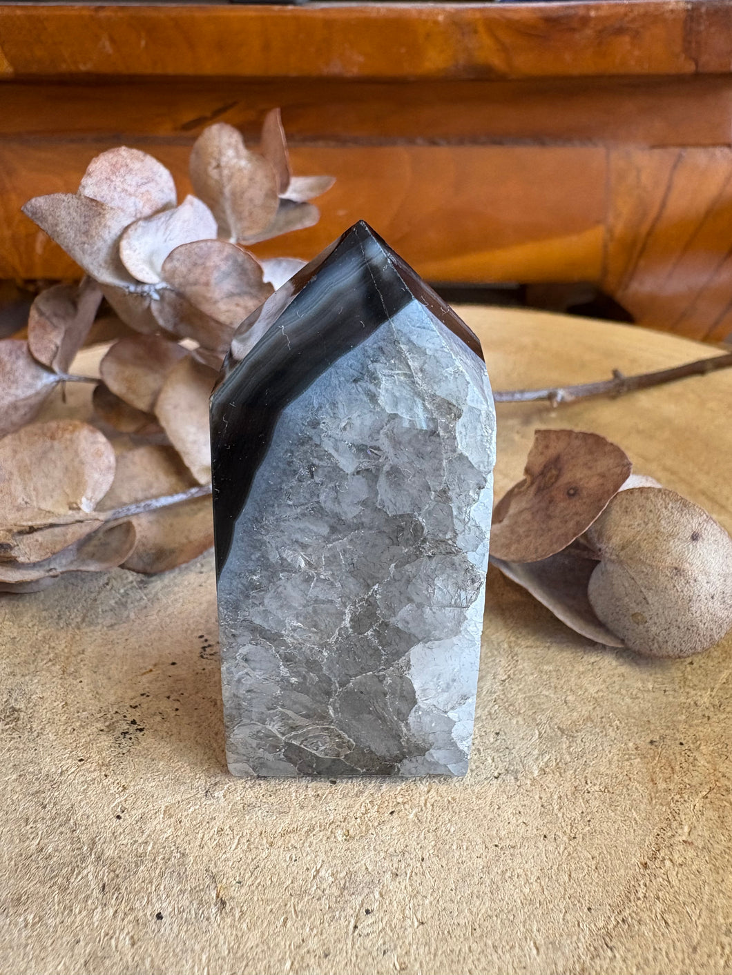 A sweet little obelisk of striking Black Banded Agate, with a fair but of Quartzy goodness.
