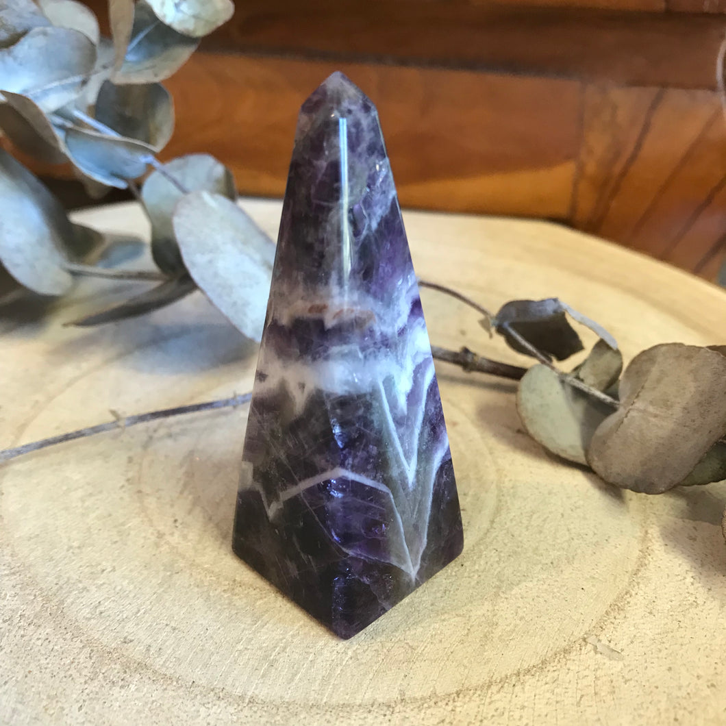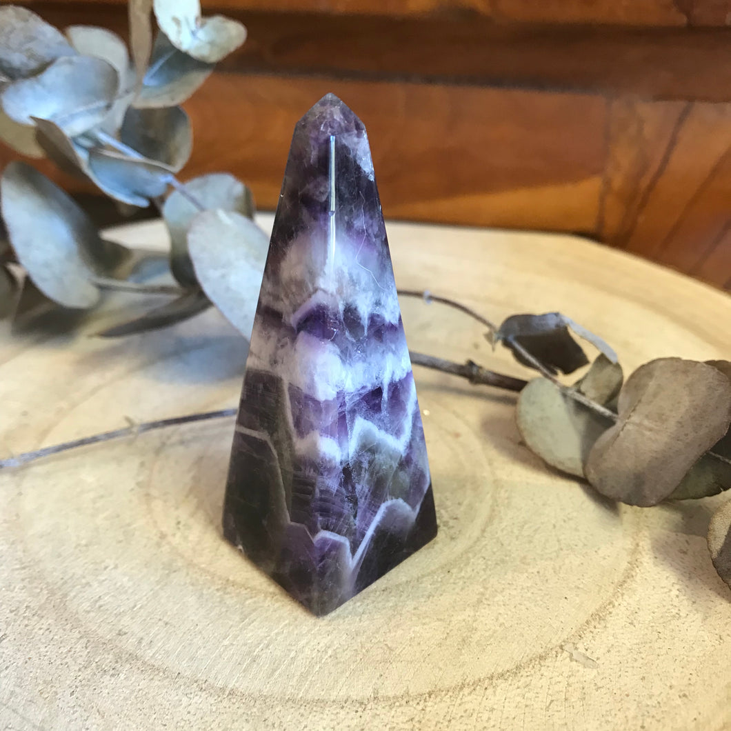 A beautiful obelisk of Chevron Amethyst showing the characteristic zigzagging of the Quartz caught within the Amethyst.