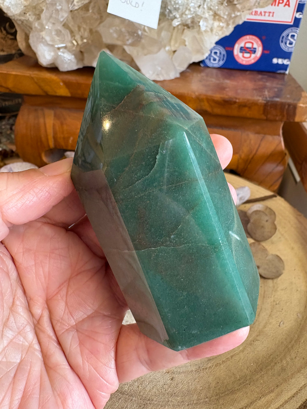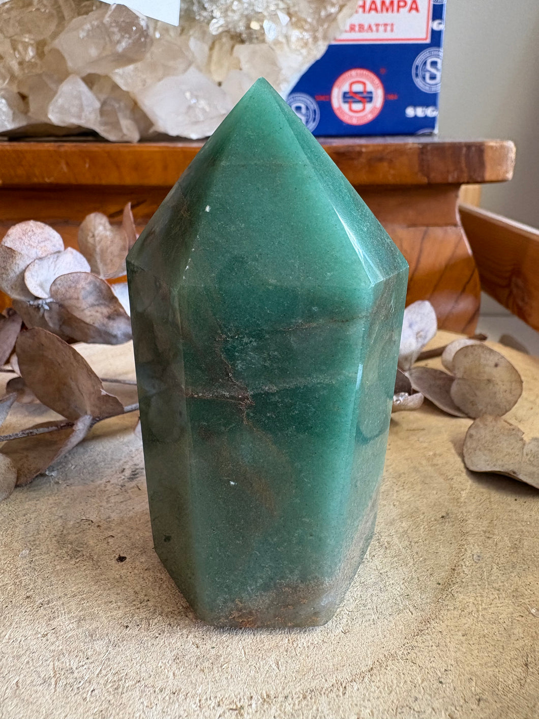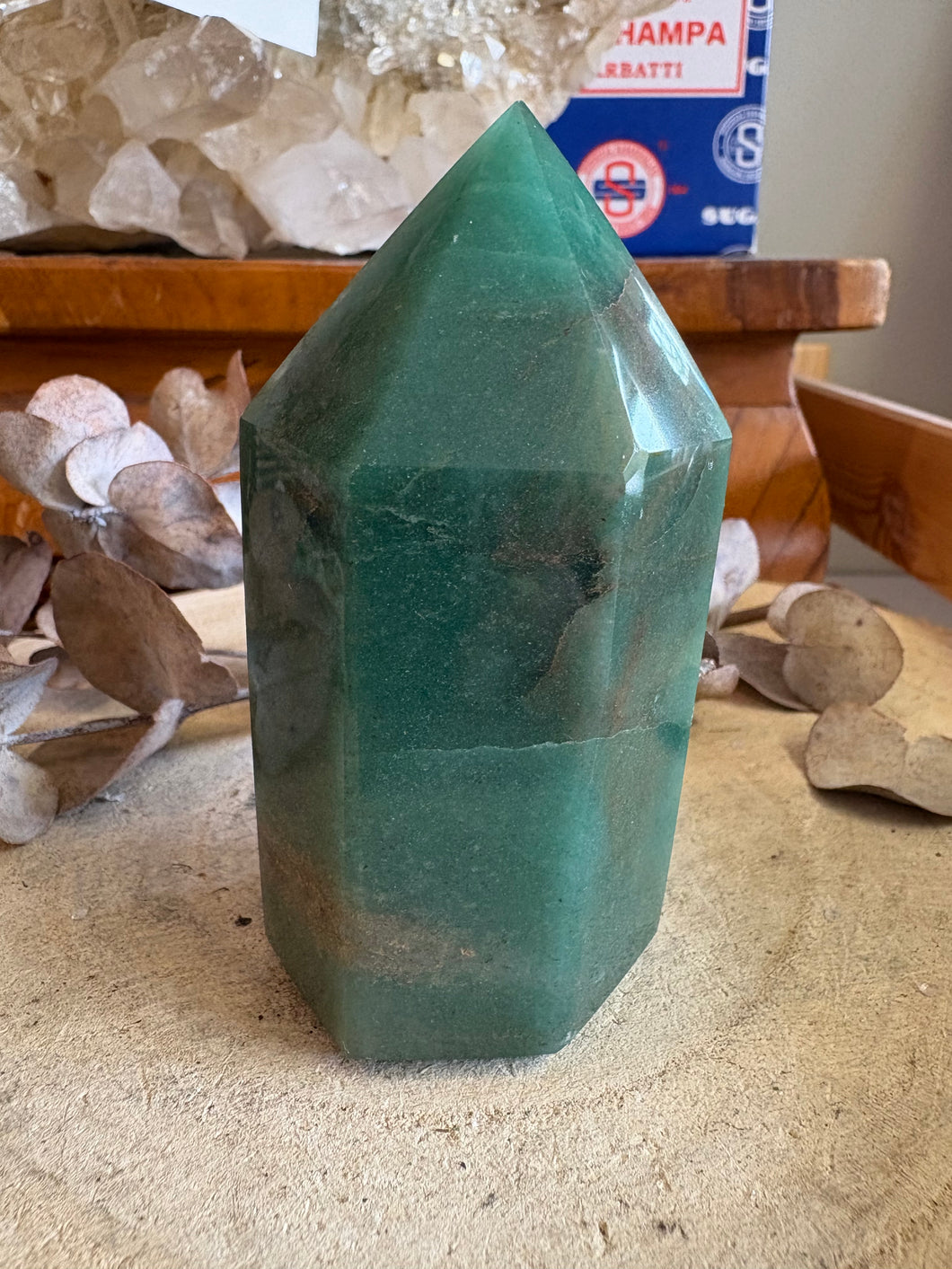 A richly coloured point of Green Aventurine, which has the traditional green mixed with veins of brown.