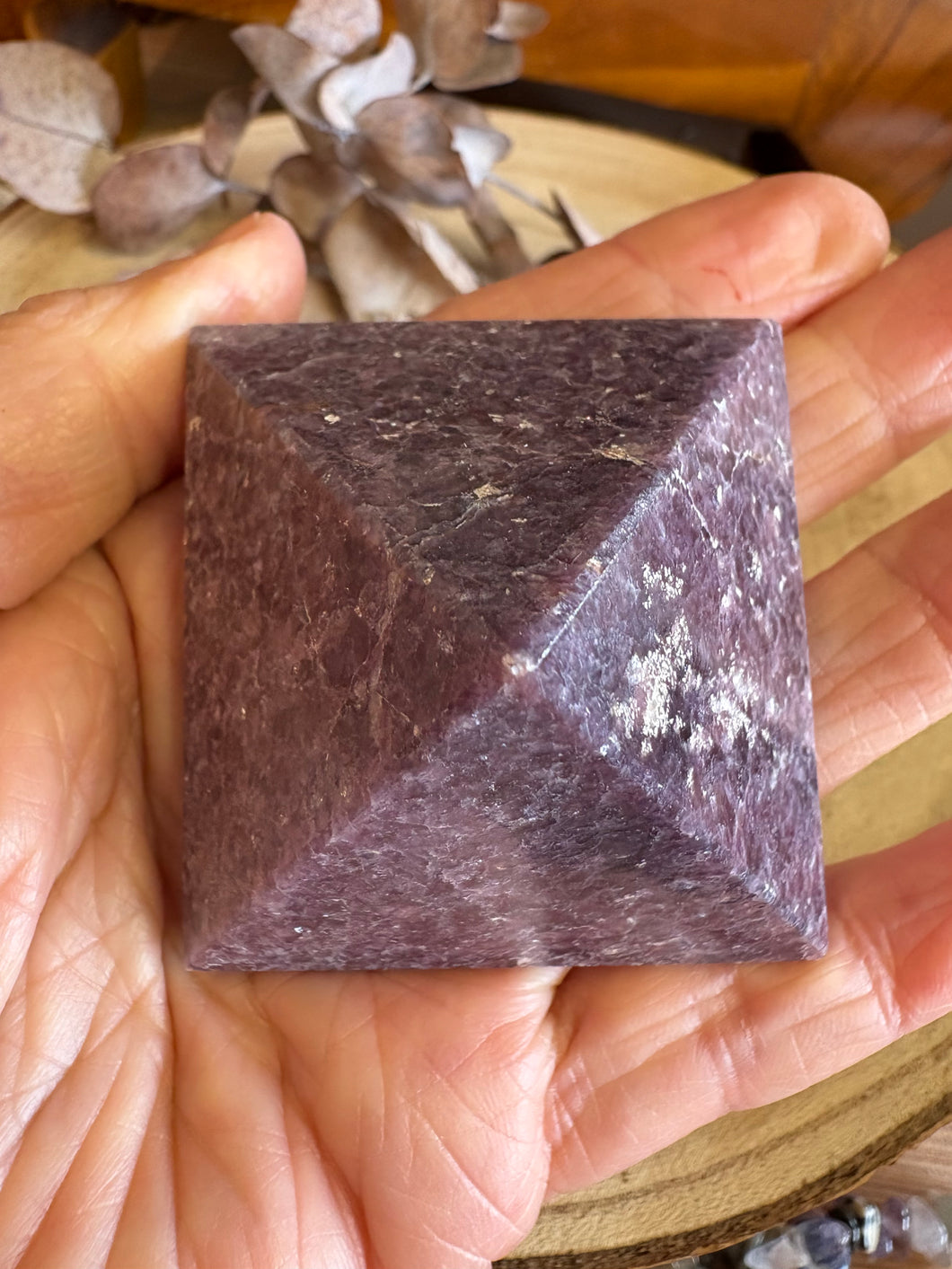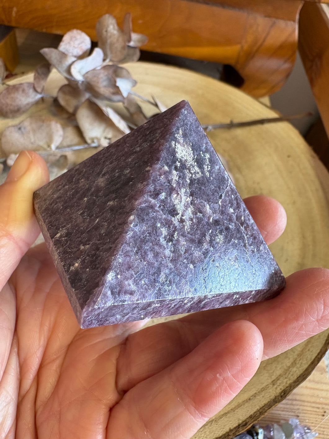 A richly purple and sparkling Lepidolite pyramid, which is thought to help balance mood and ease stress and anxiety.