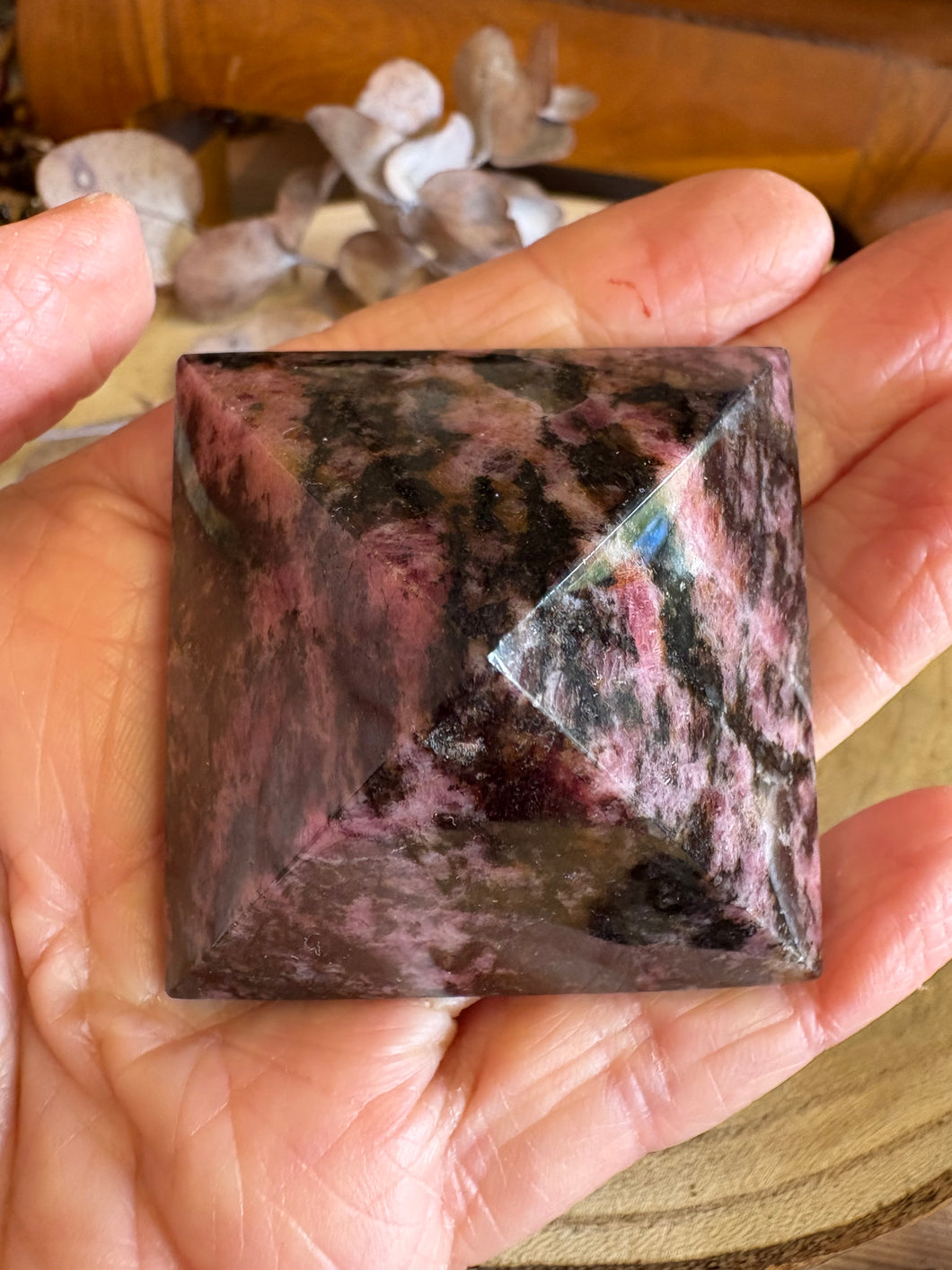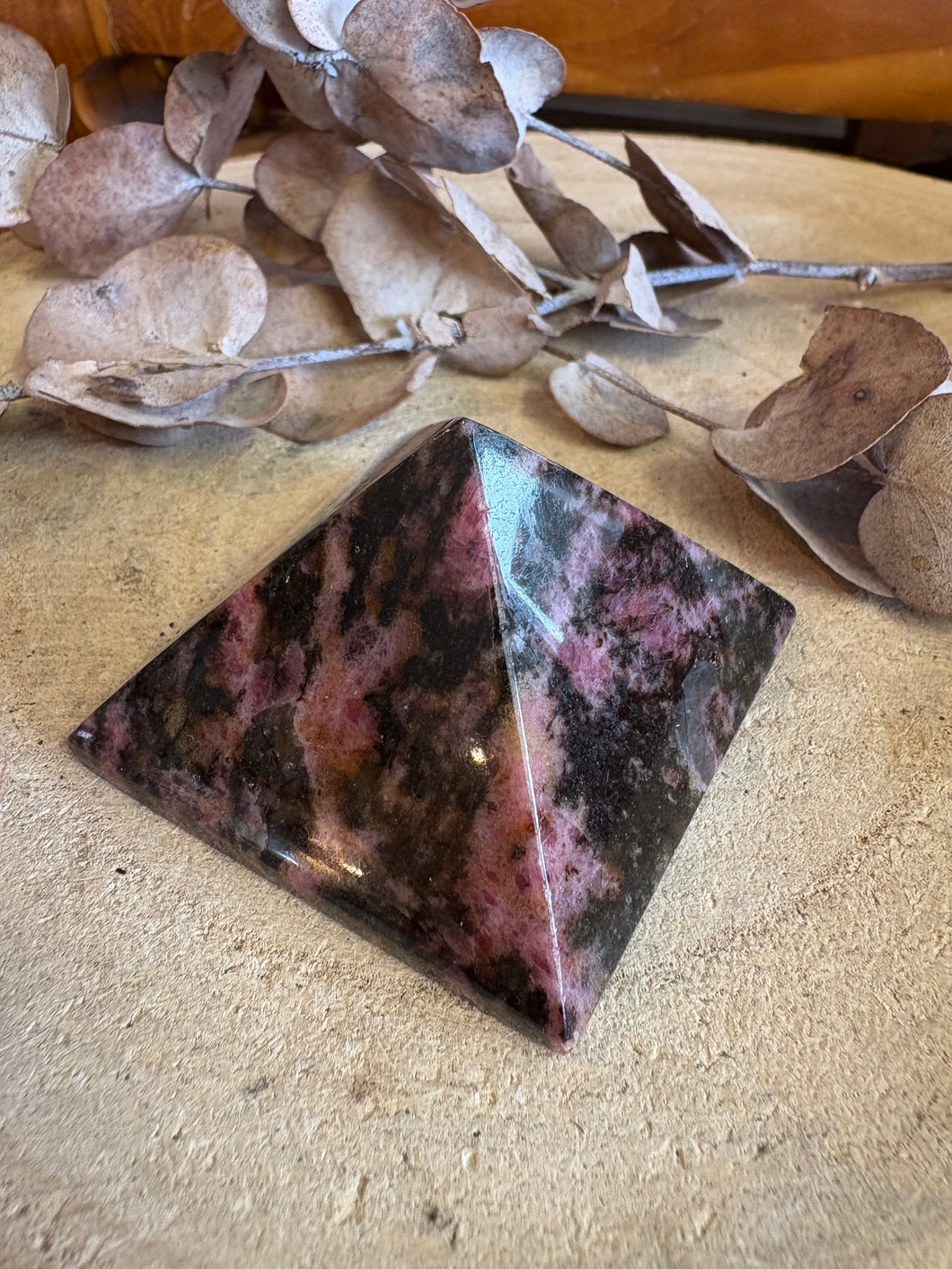 A colourful pyramid of the emotional healing crystal force that is Rhodonite.
