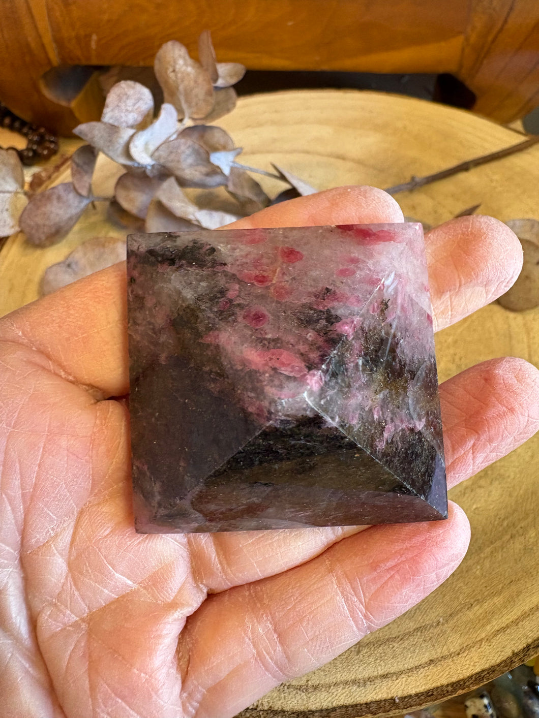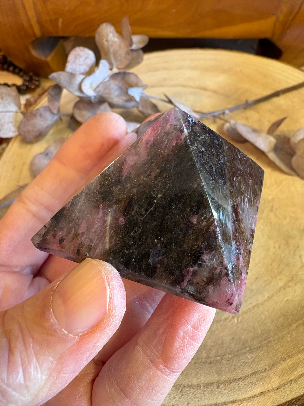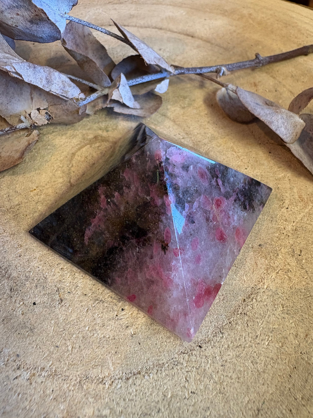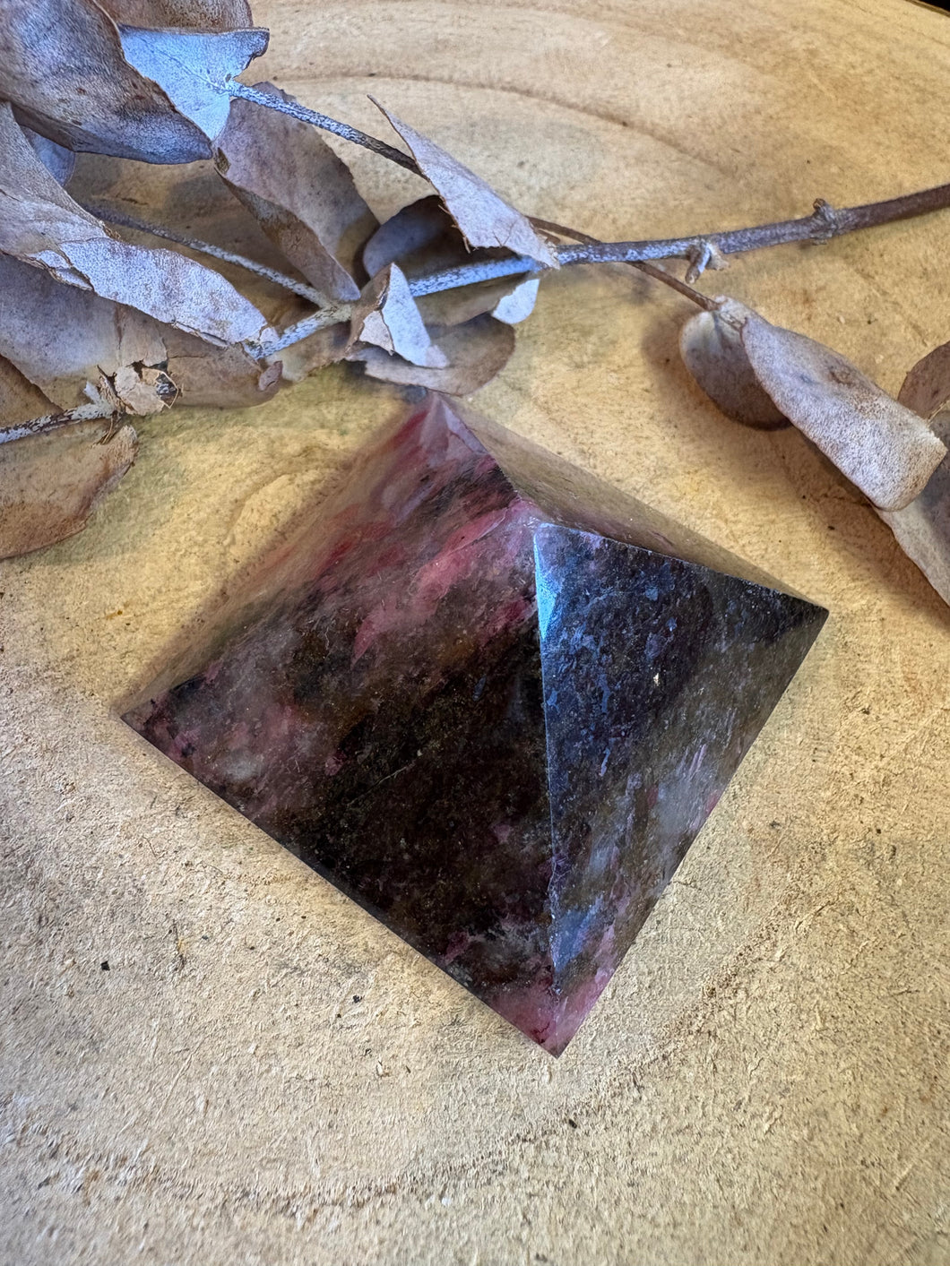 A colourful pyramid of Rhodonite which is thought to be good for emotional healing.