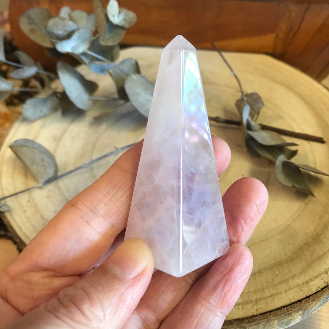 An ethereal looking obelisk of Rose Aura Quartz, which really is quite magical with its soft rainbow sheen.