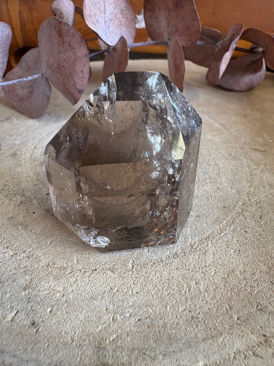 A cute and light filled point of gently grounding and protective Smoky Quartz.
