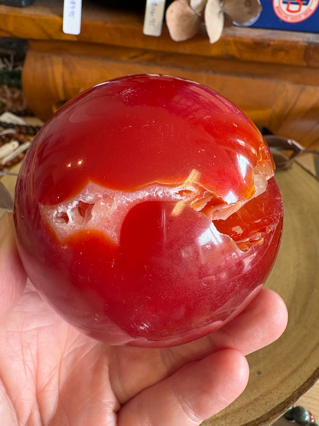 A vibrant and colourful Carnelian large sphere, with a naturally occurring crevice, which just adds to its character and charm.