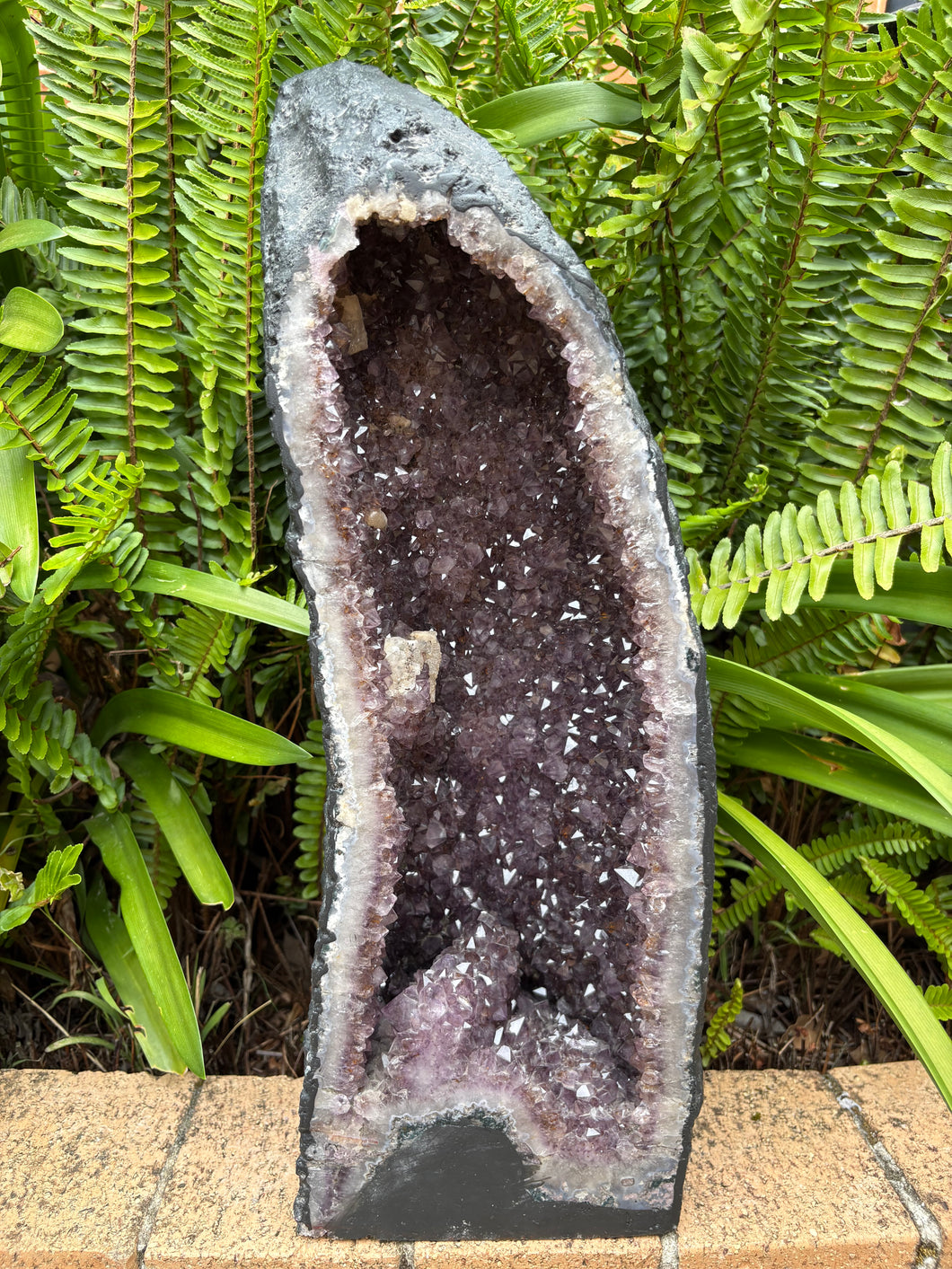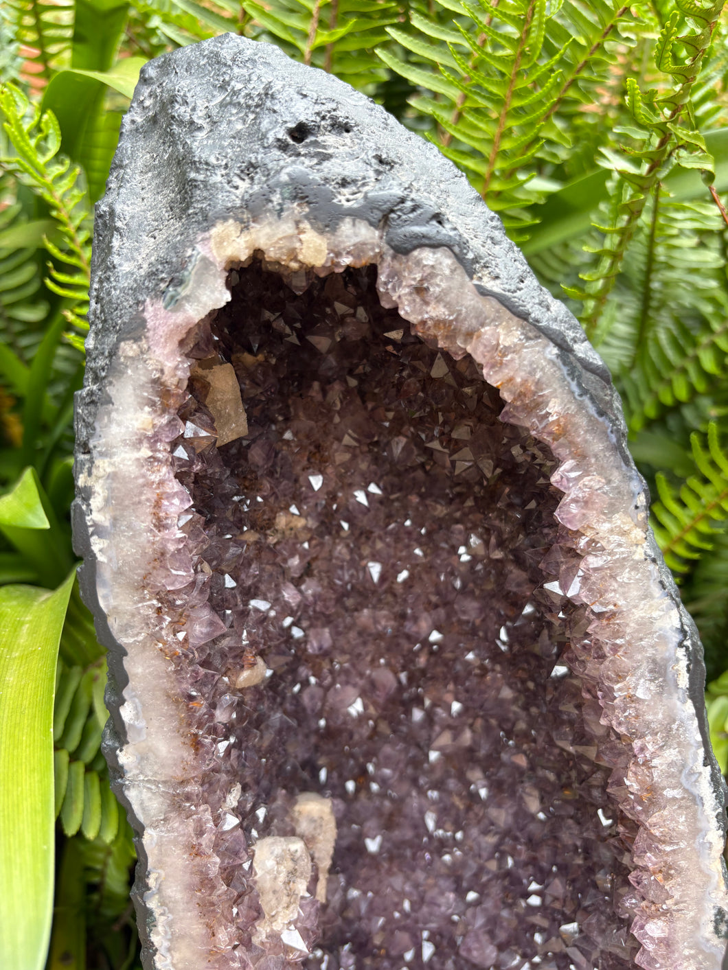 This is a stunning Amethyst Cave which features a couple of Calcite inclusions and the bronze brilliance of Cacoxenite caught within the Amethyst points.