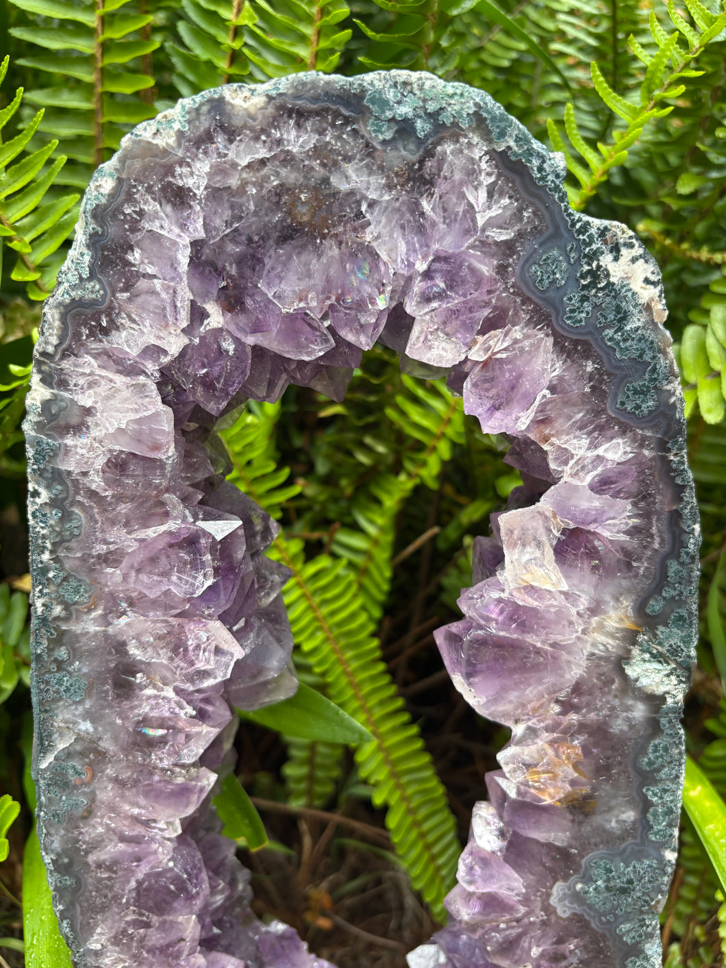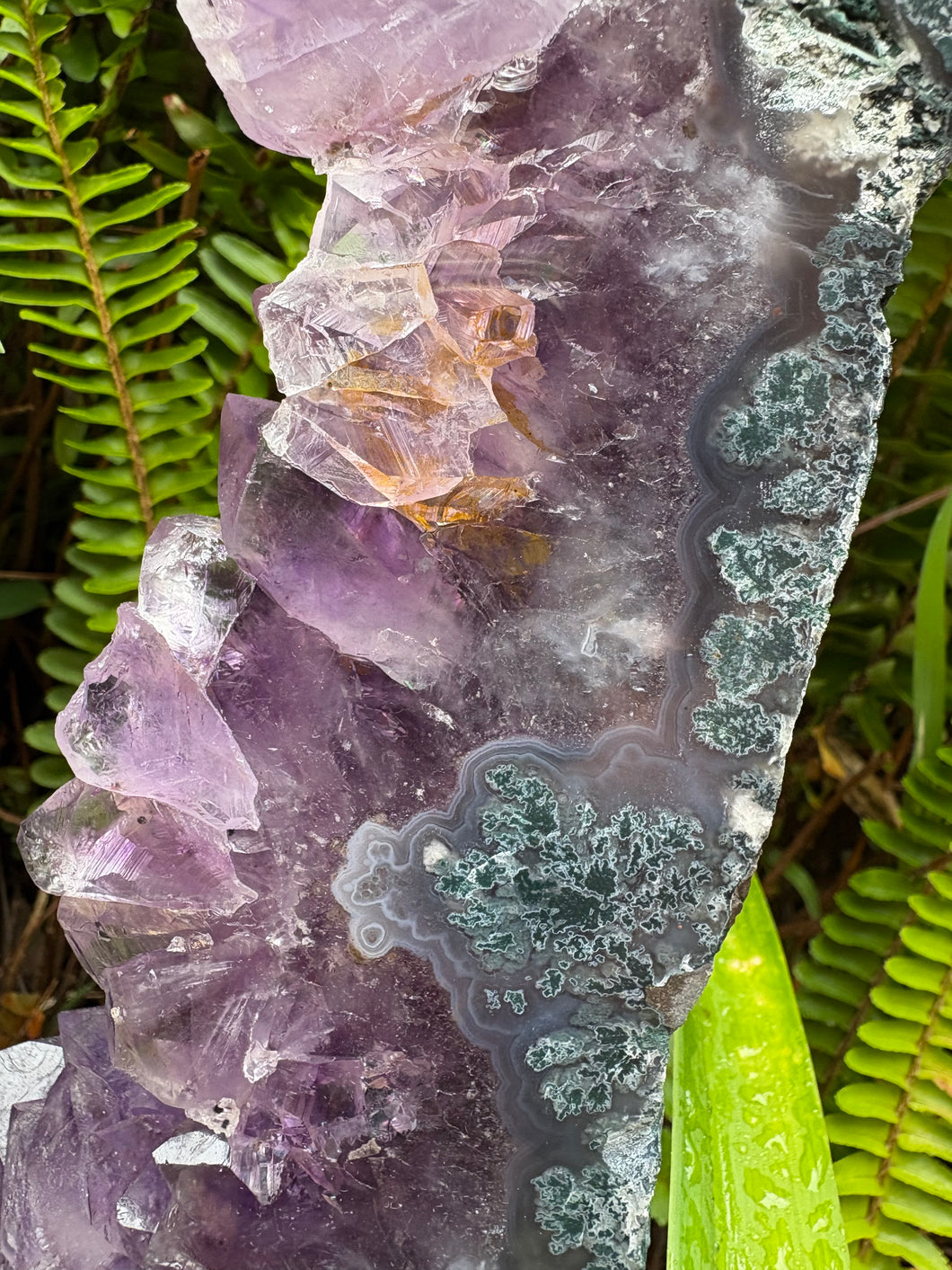 A stunning and really rather magical Amethyst portal, which has plenty of Moss Agate caught around its polished edge.