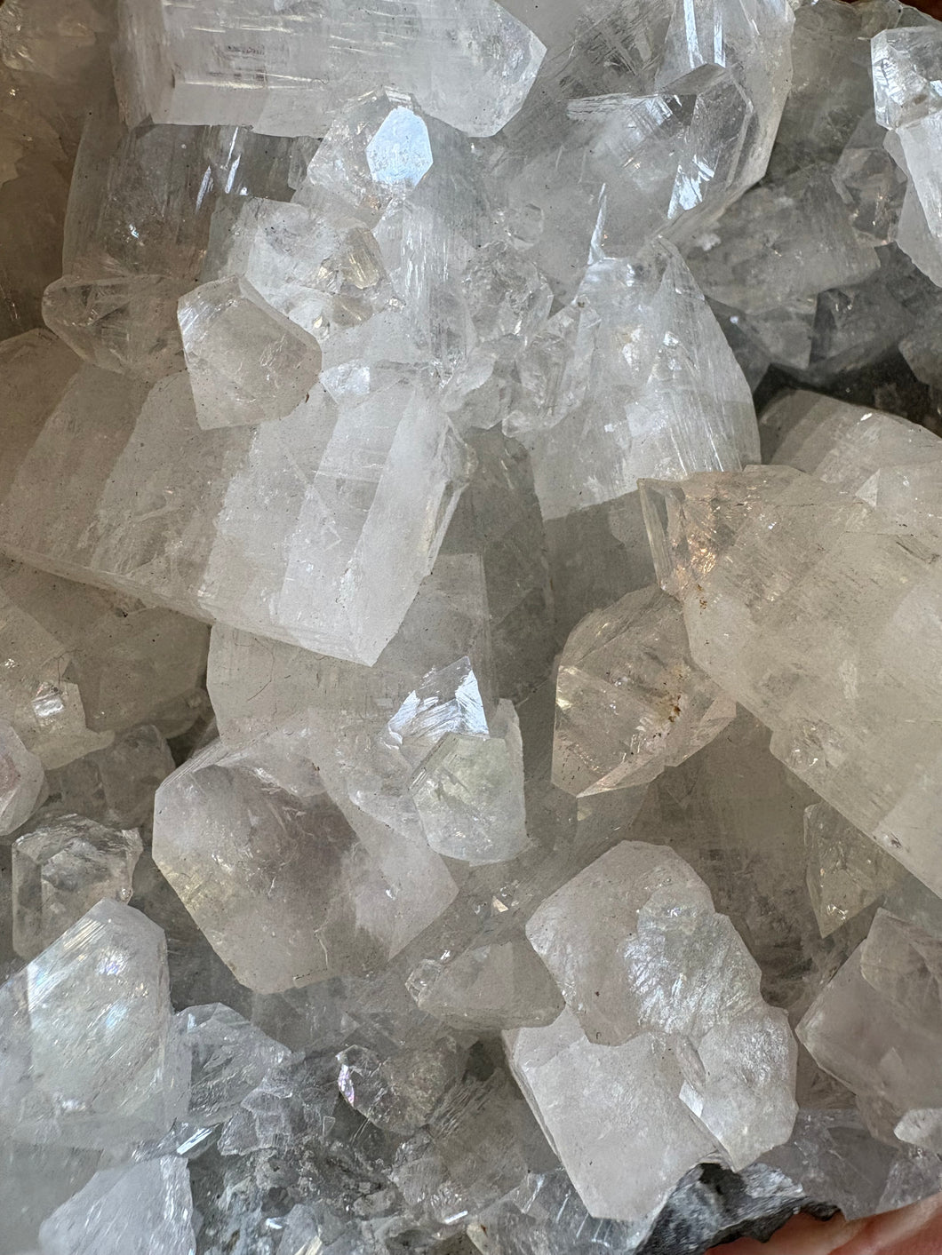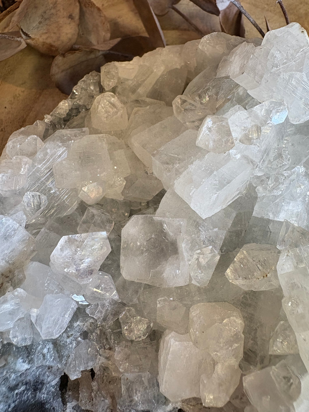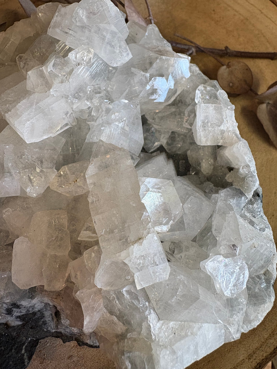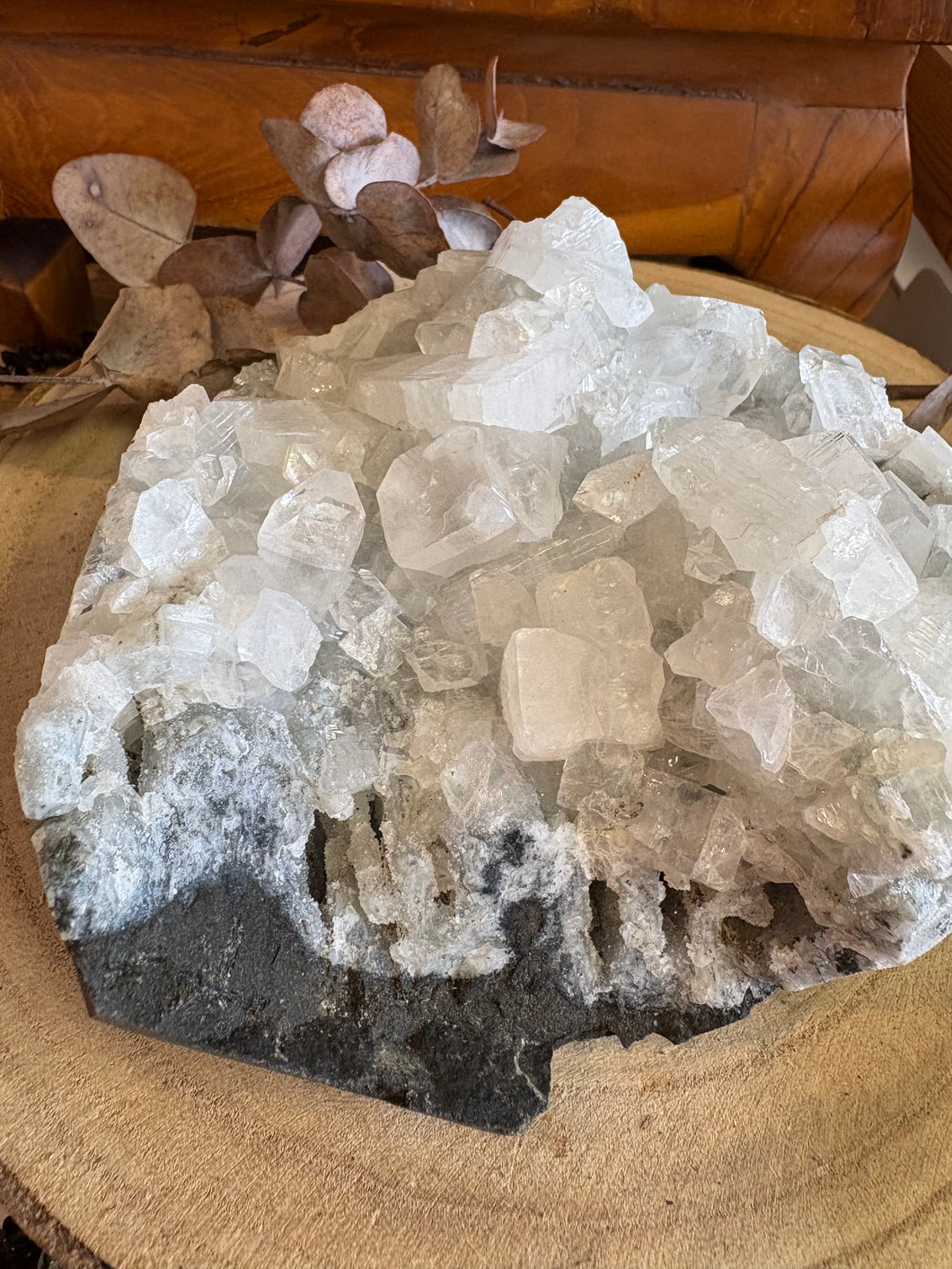 This is a cluster of pure Apophyllite with some small chambers of Chalcedony on and around its base.