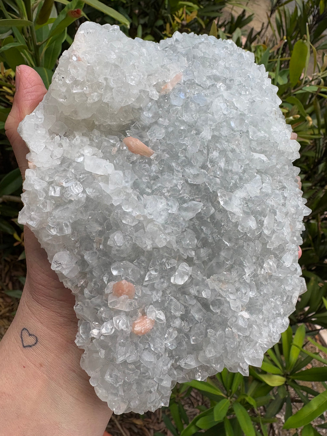 This is a pretty and sparkly cluster of high vibrational Apophyllite, with a smattering of Stilbite.