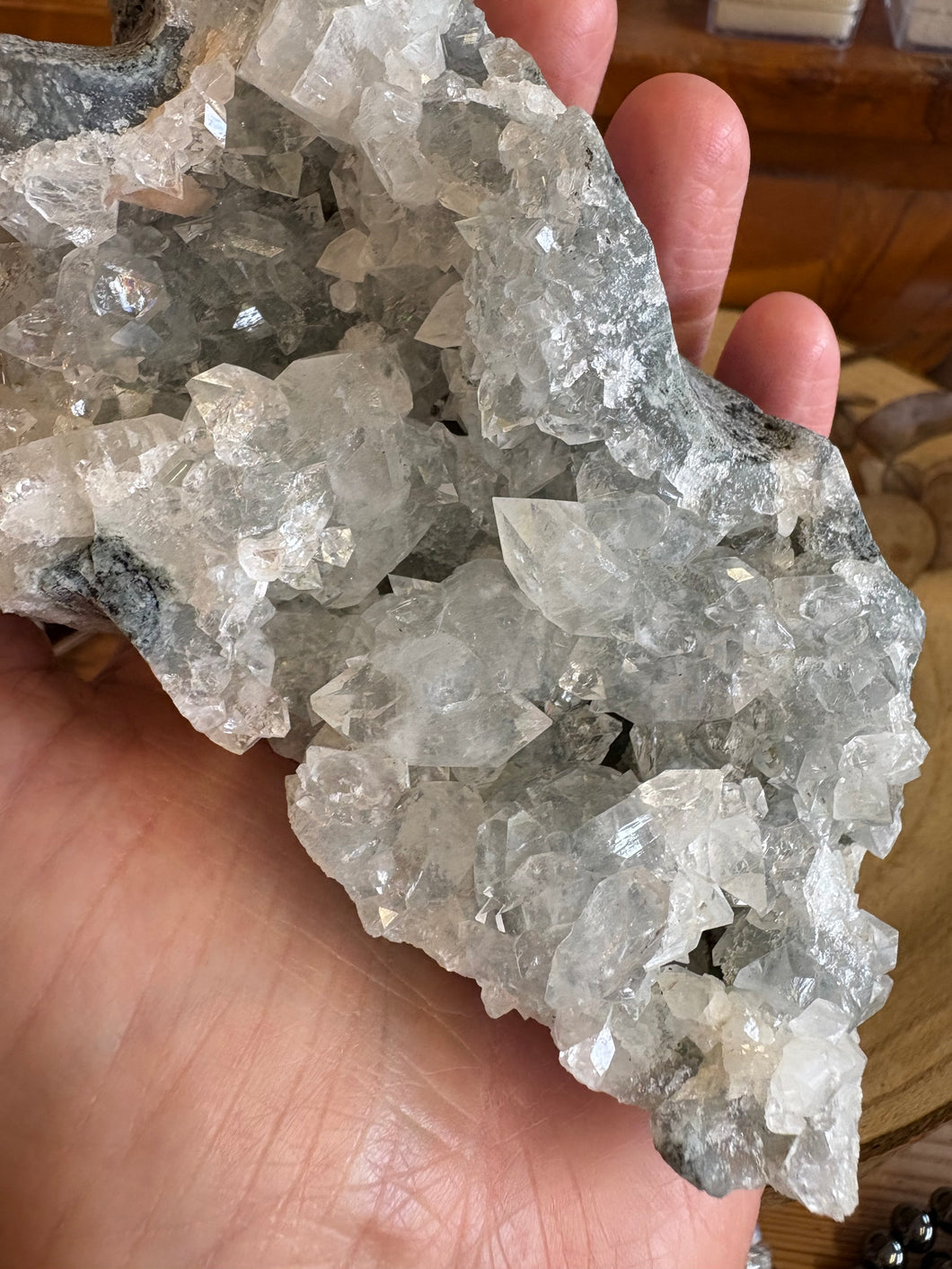 A sparkling cluster of high vibrational Apophyllite, with a little smattering of Stilbite.