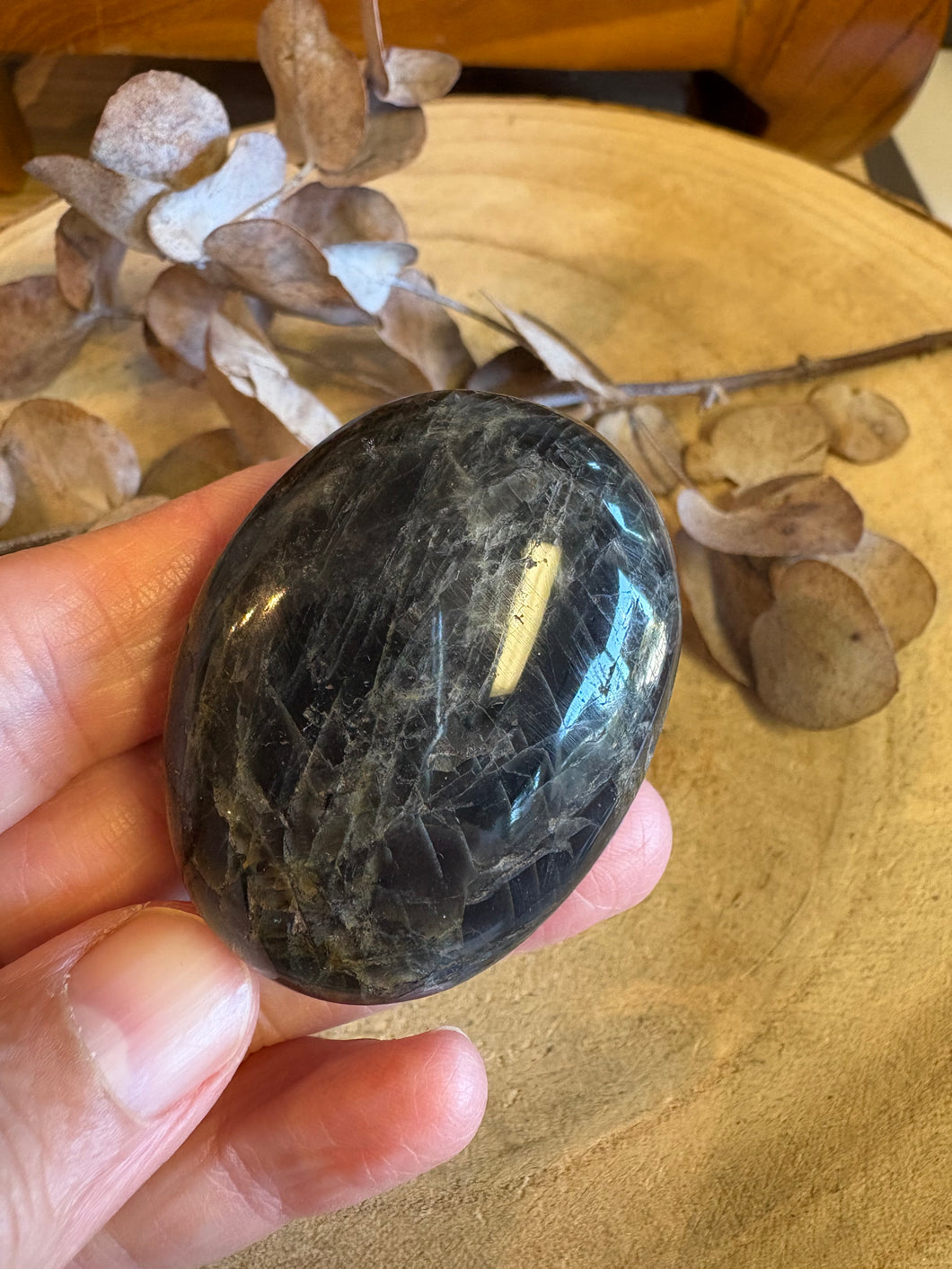 Black Moonstone Palm Stone SKU 24555