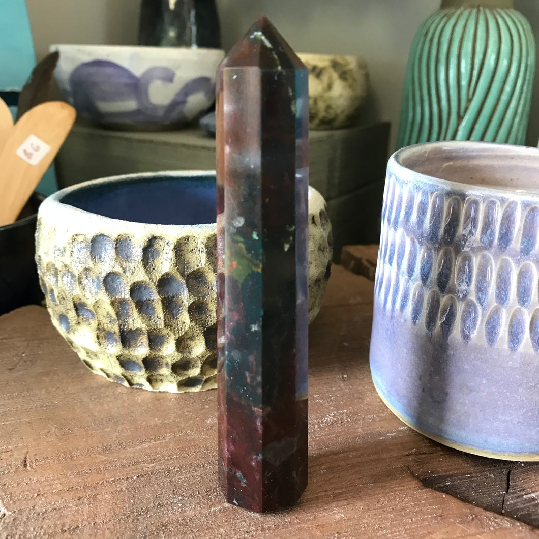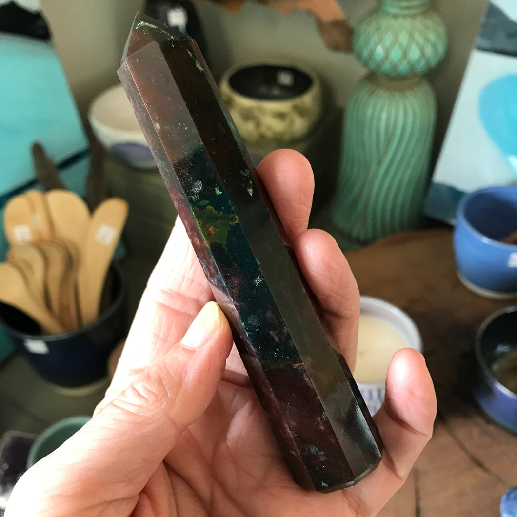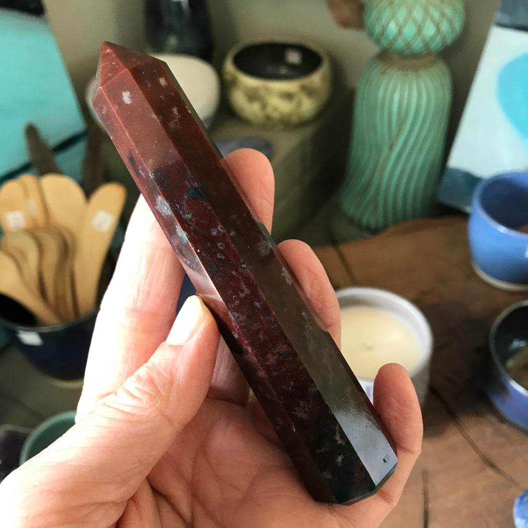 A mix of mystery and colour, this unusual Bloodstone point is bound to enchant its new keeper.