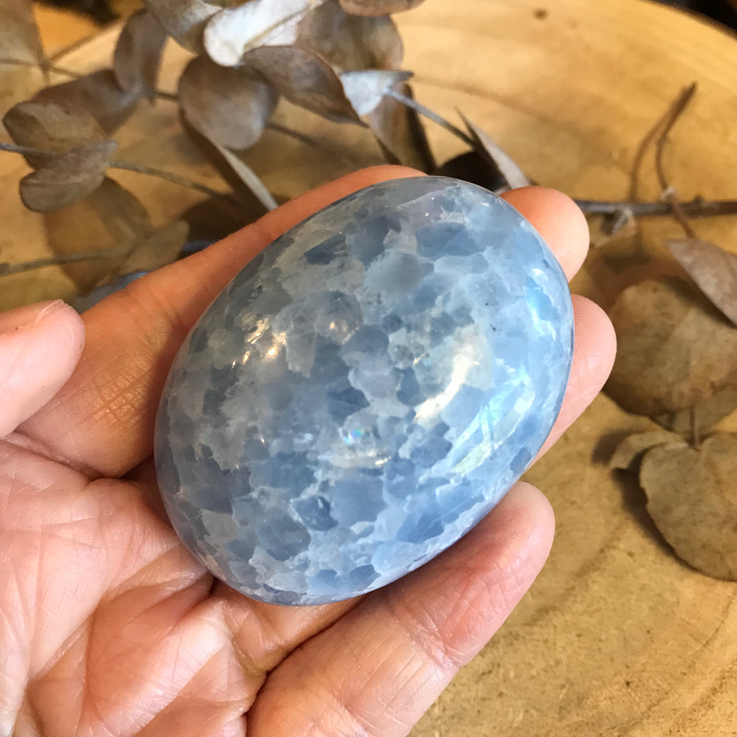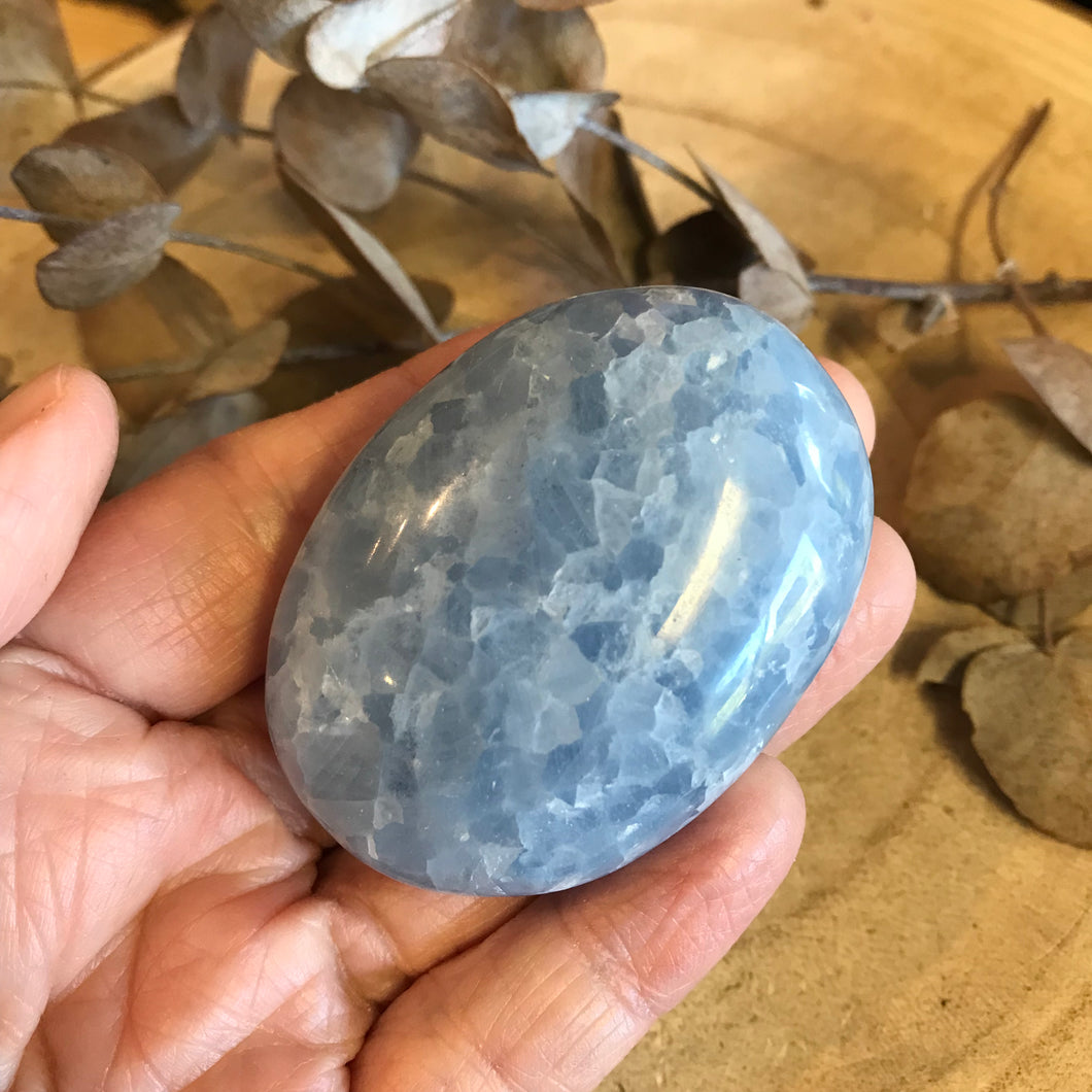 A lovely coloured and nice sized palm stone of soothing Blue Calcite.