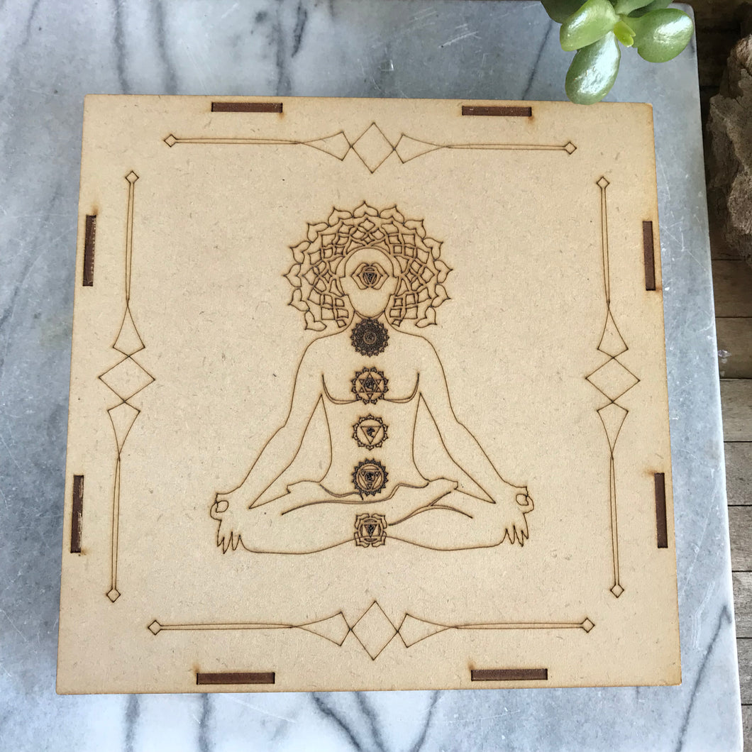 These sets feature a crystal disc representing each chakra with a symbol. The crystals features are Amethyst, Sodalite, Green Aventurine, Yellow Aventurine/Jasper, blue Aventurine, Peach Aventurine & Red Jasper.