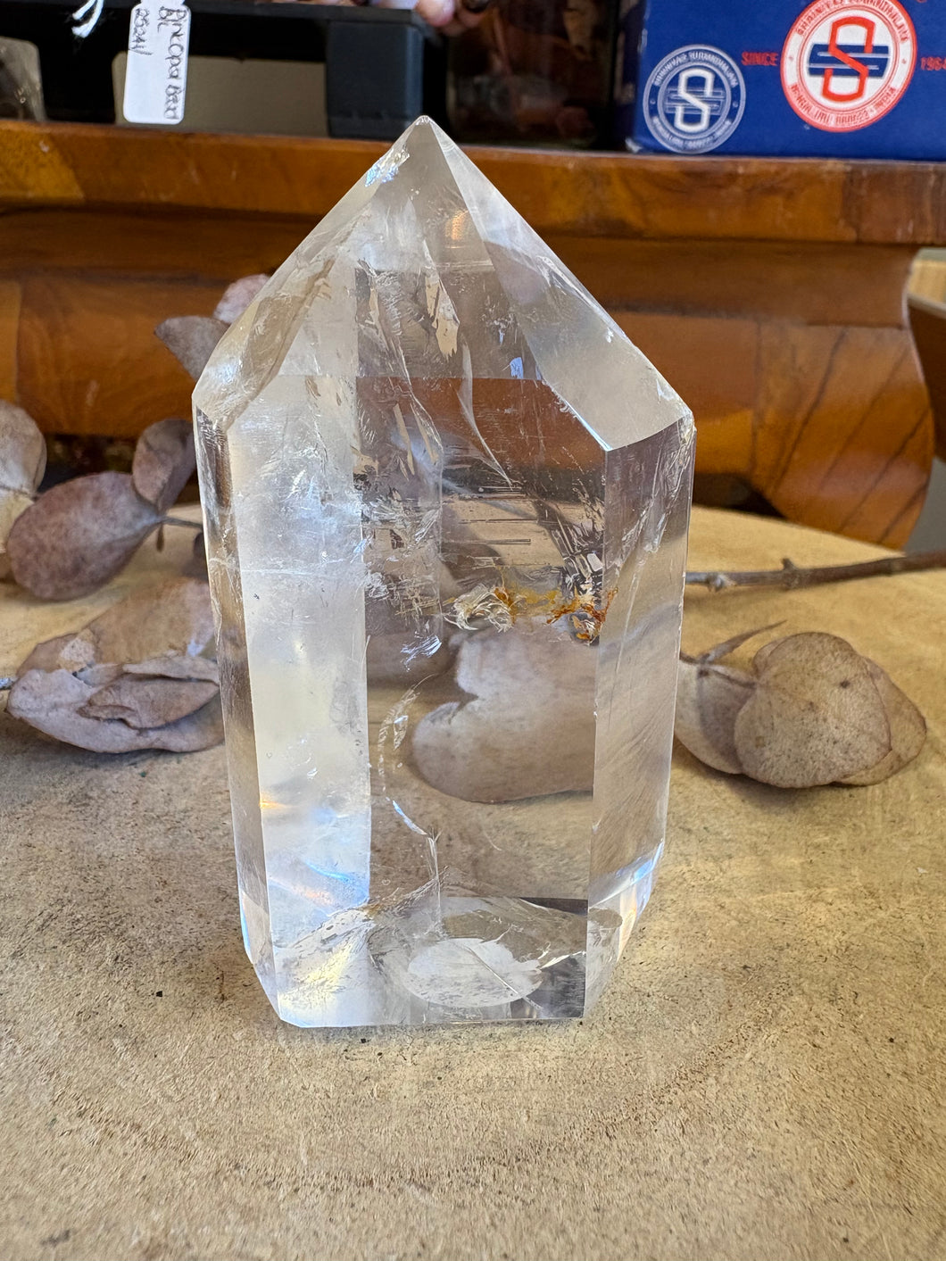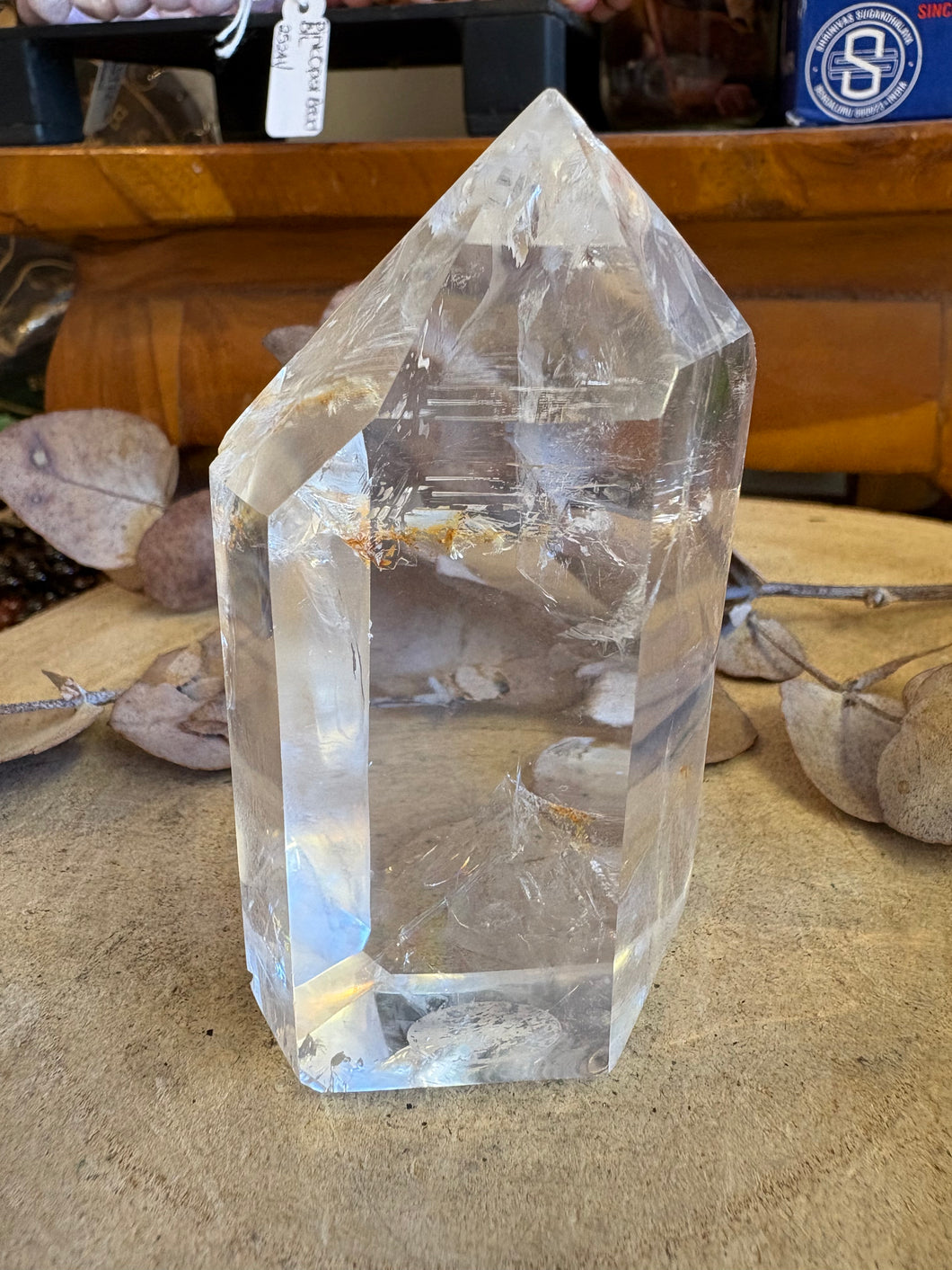 Such a stunningly clear point, with a small mineral inclusions which lends some colour and interest, plus a rainbow filled ‘mountain’ in its base.