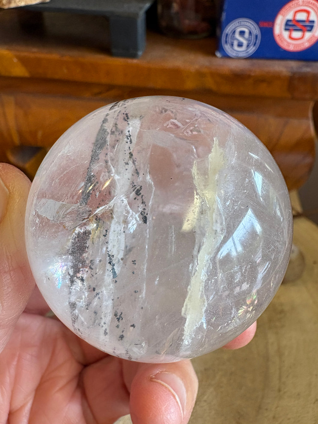 This magical sphere of Clear Quartz also has some interesting mineral inclusions in what looks to be a phantom like growth formation.