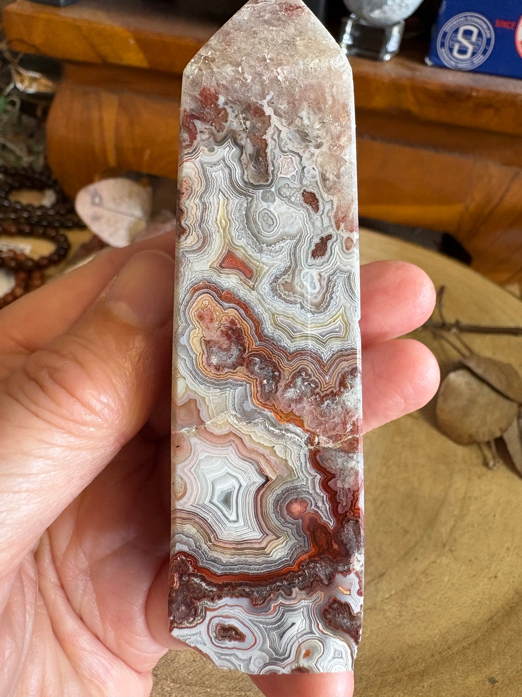 This is a colourful and visually striking obelisk of Crazy Lace Agate, which has a couple of pockets of Druzy sparkle in it.