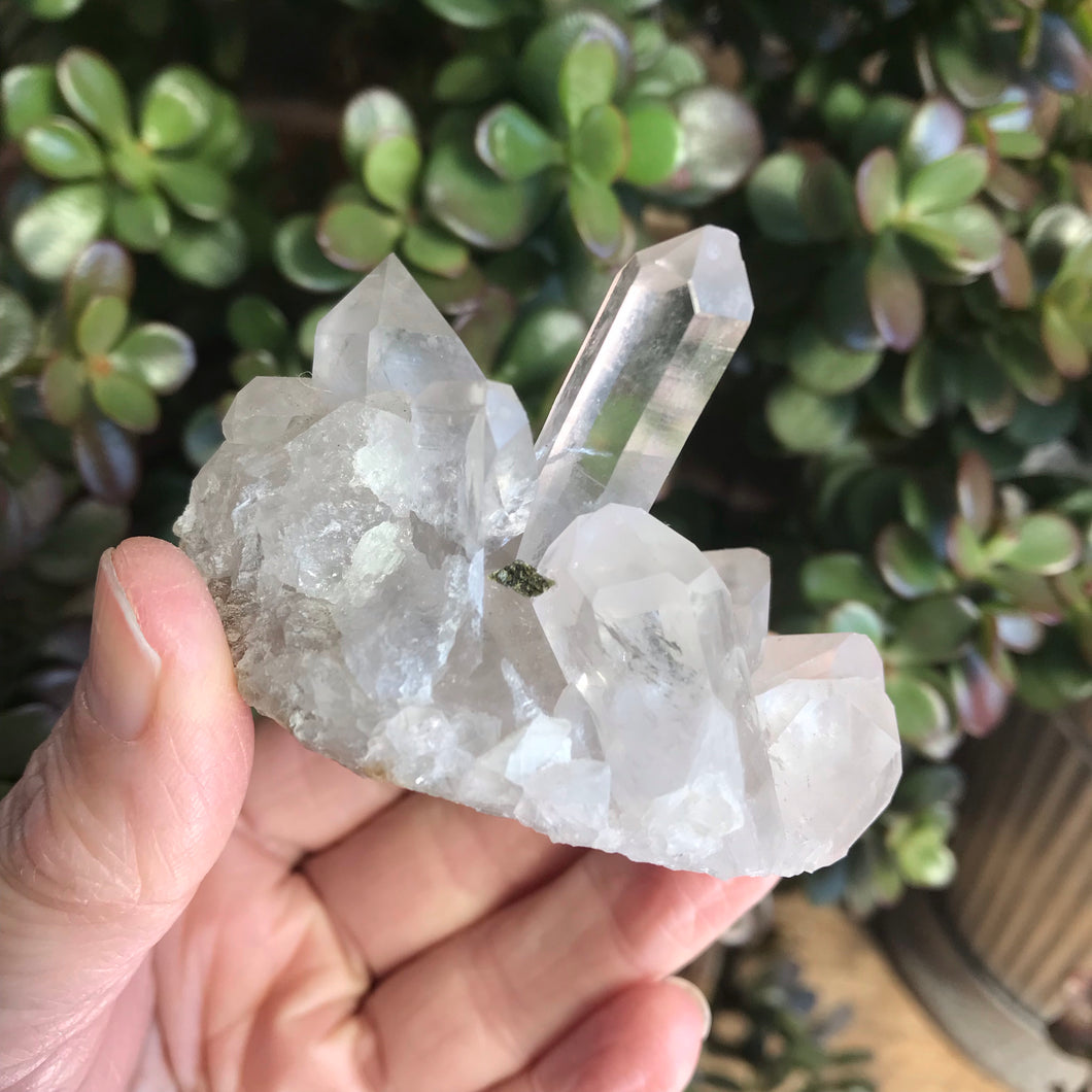 This lovely Quartz cluster has a little smattering of Epidote through one point and nestled between points, plus an area on it’s base too.